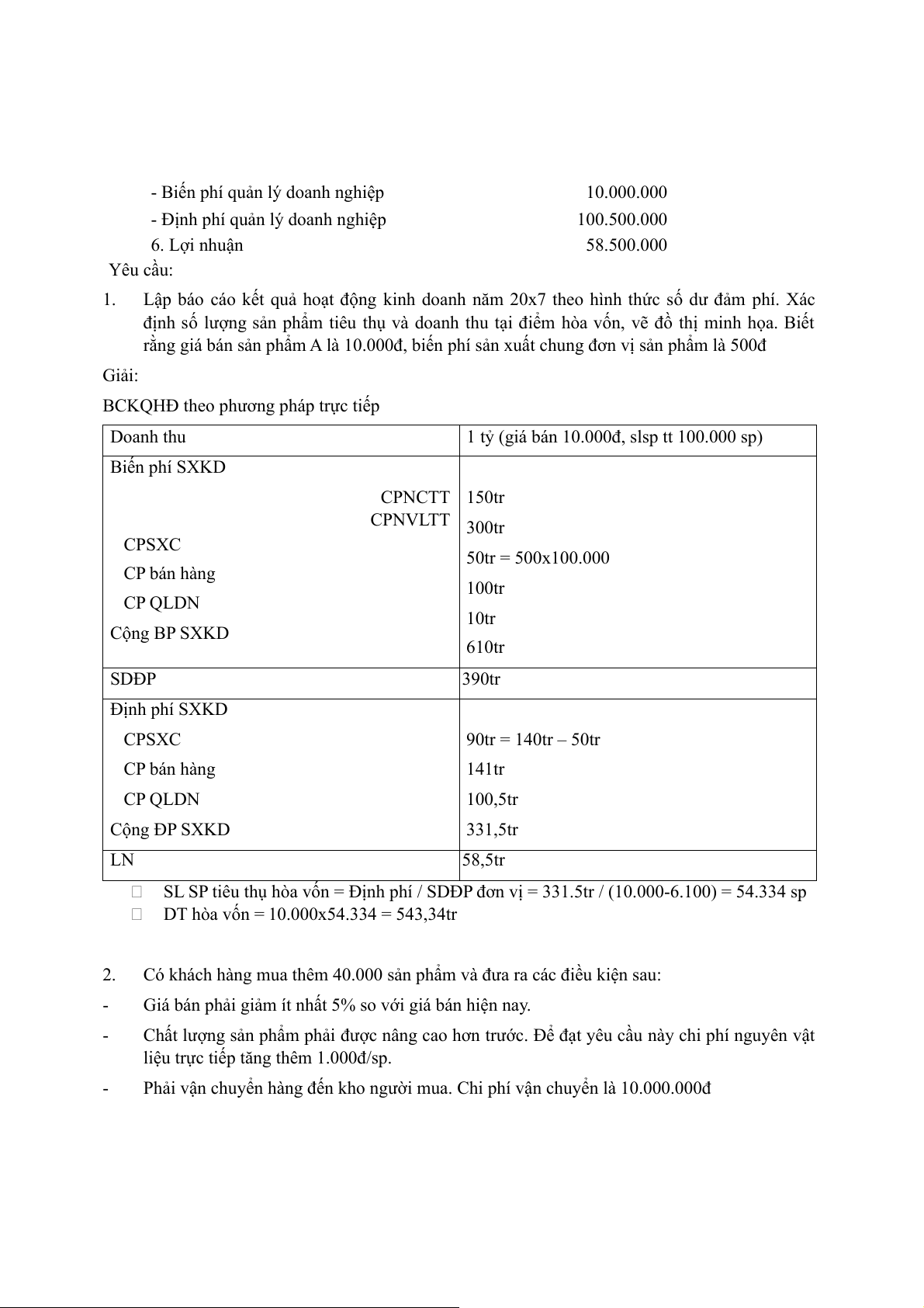 2. Giá bán, chi phí đơn vị không đổi.