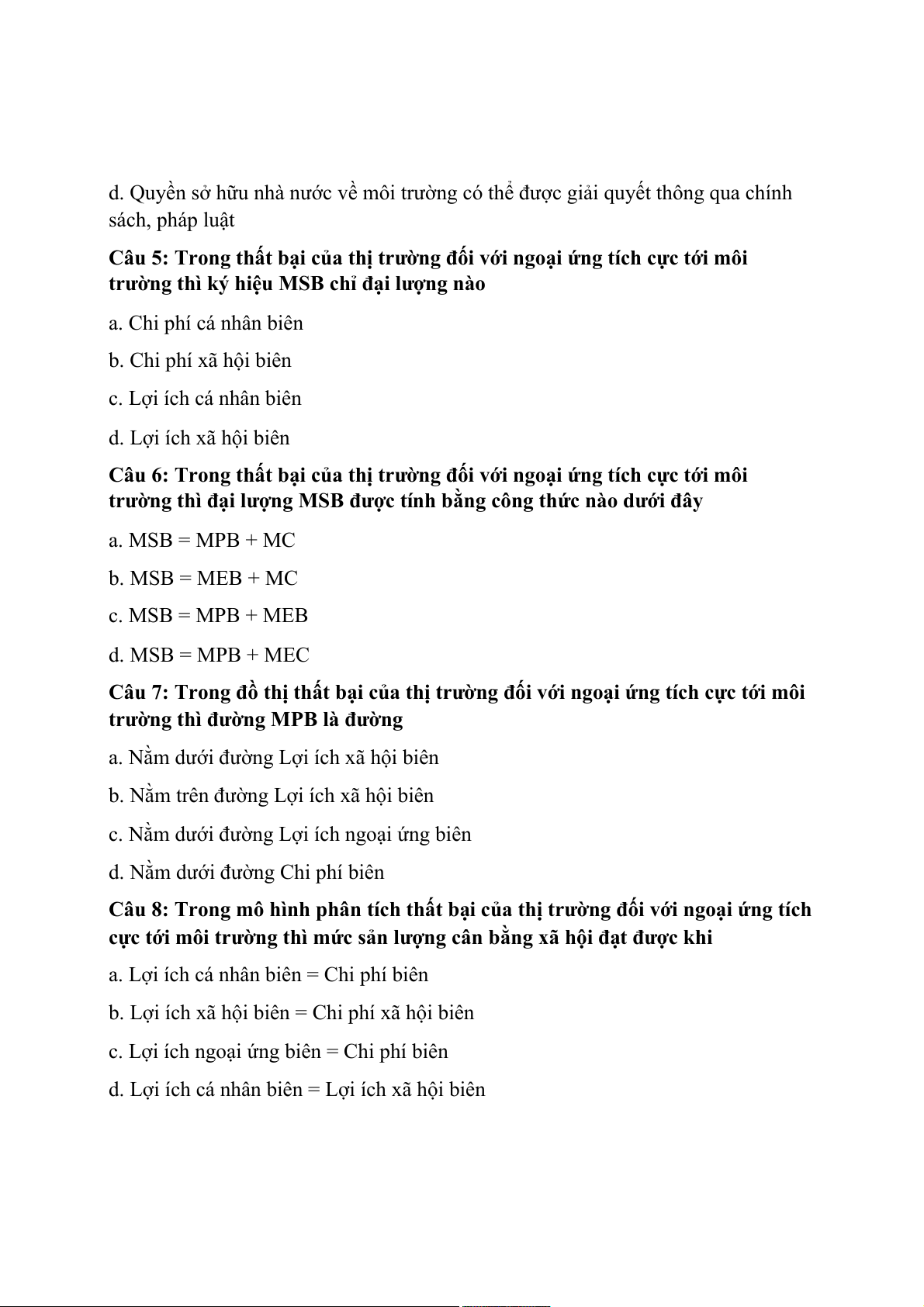 d. Lợi ích cá nhân biên = Lợi ích xã hội biên
