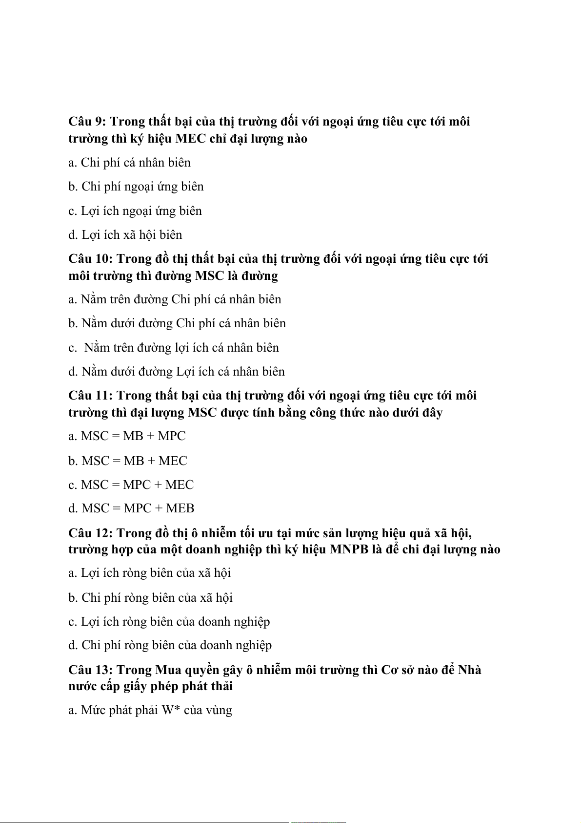 Câu 9: Trong thất bại của thị trường đối với ngoại ứng tiêu cực tới môi