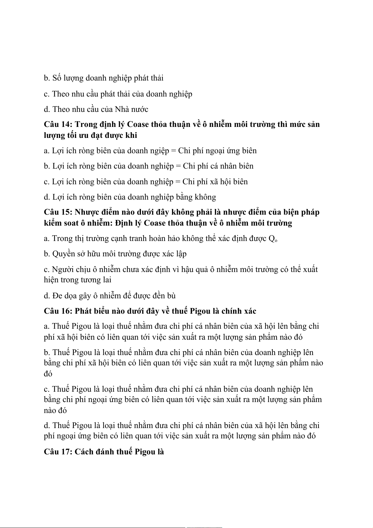 d. Thuế Pigou là loại thuế nhằm đưa chi phí cá nhân biên của xã hội lên bằng chi