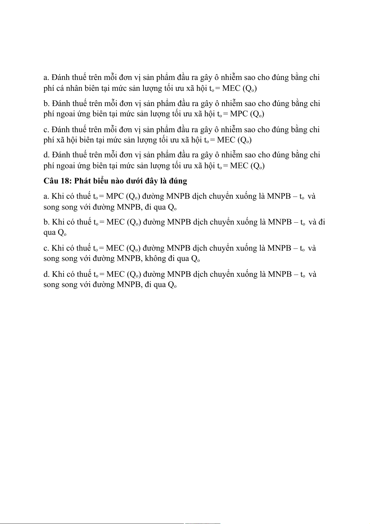 d. Khi có thuế to = MEC (Qo) đường MNPB dịch chuyển xuống là MNPB – to và