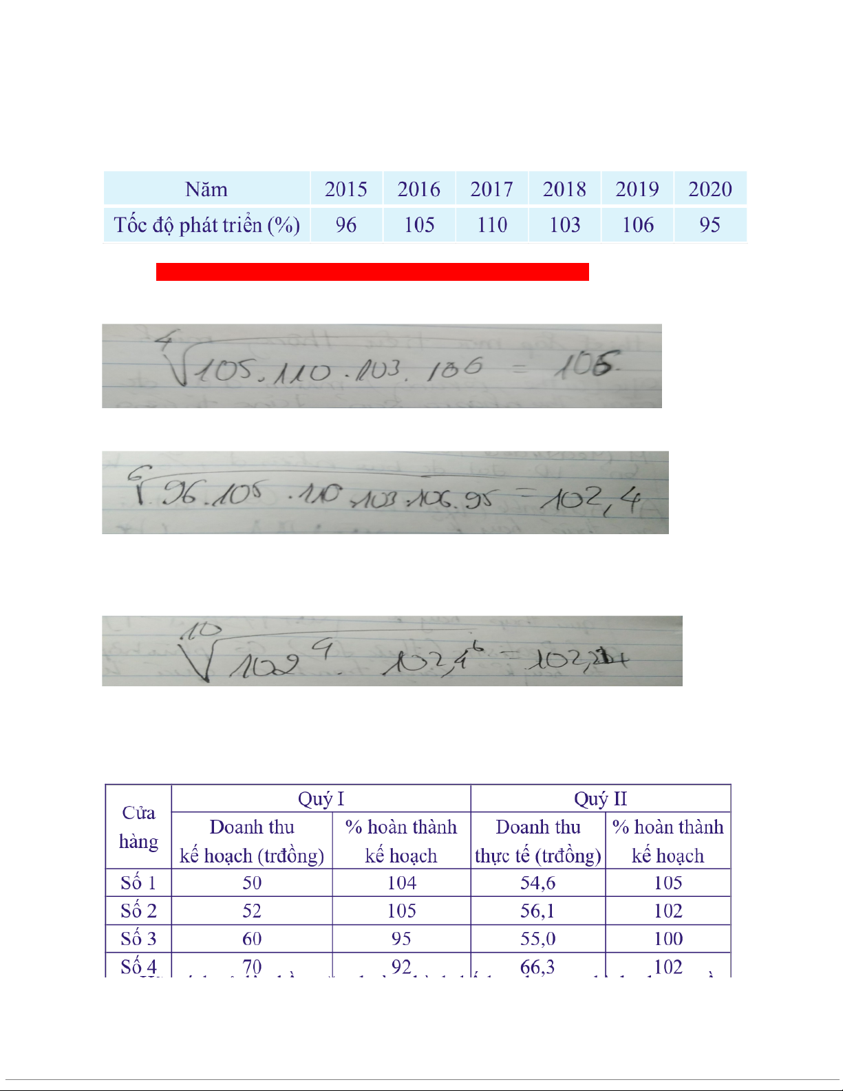 Hãy tính tỷ lệ phần trăm hoàn thành kế hoạch trung bình chung về doanh thu của bốn cửa hàng trên: a. Trong quý I (104+105+95+92)/4=99 b. Trong quý II (105+102+100+102)/4=102.25 c. Trong 6 tháng đầu năm (99*4+102.25*4)/6=134.167