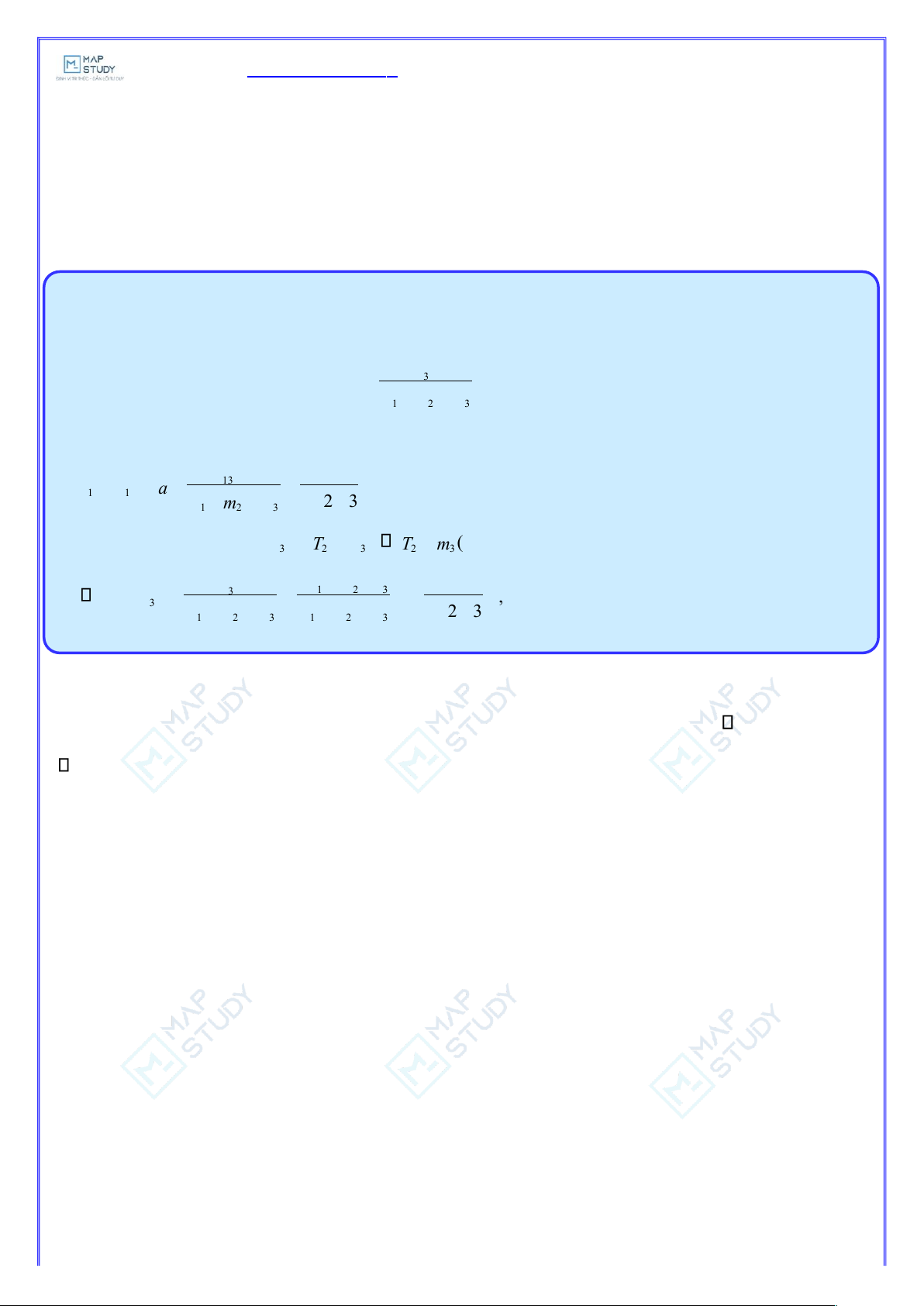 động với cùng một gia tốc a. Ta có: = a + + 1 mmm 2 3 Xét riêng vật ta có: mmg 1.3.9,8 13 T =ma a == = = , 4 9( N ) 1 1 m m ++ m 1++ 1 2 3 2 3 Xét riêng vật −= = 3 m ta có: 3 mg 2 T 3 ma − 2 T 3 ( mg a ) mg ( m +m m (1+ 3 1 2 ) 2).3 3 T =mg − = g = , .9 8 14 = , 7( N) 2 3 m +m +m m +m +m 1 2 ++ 3 1 2 3 1 2 3