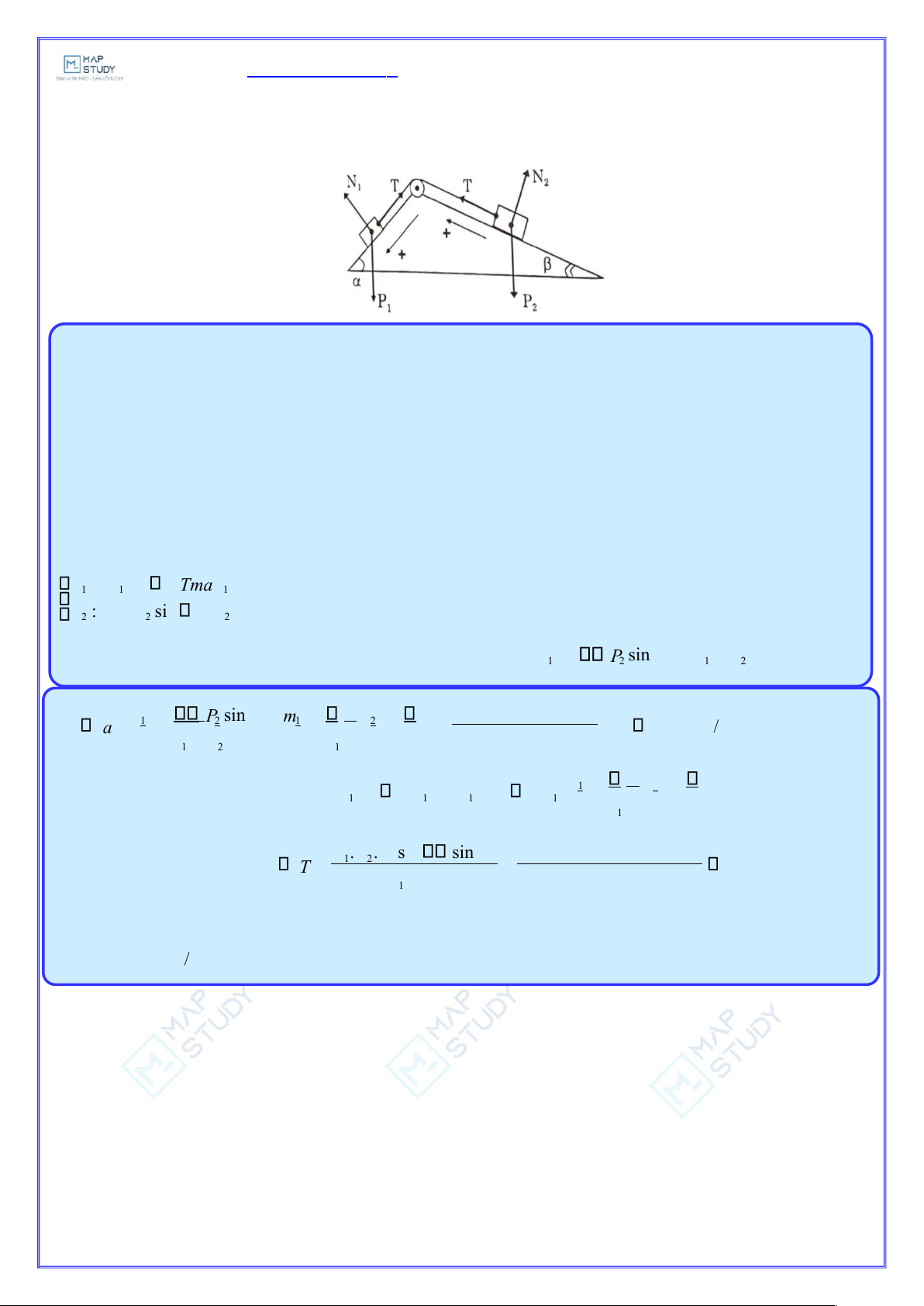 Phương trình định luật II Newton được chiếu lên phương chuyển động của các vật: −= 1 m : 1 P sin Tma 1 (1) − 2 : mTP = 2 sin 2 ma (2)