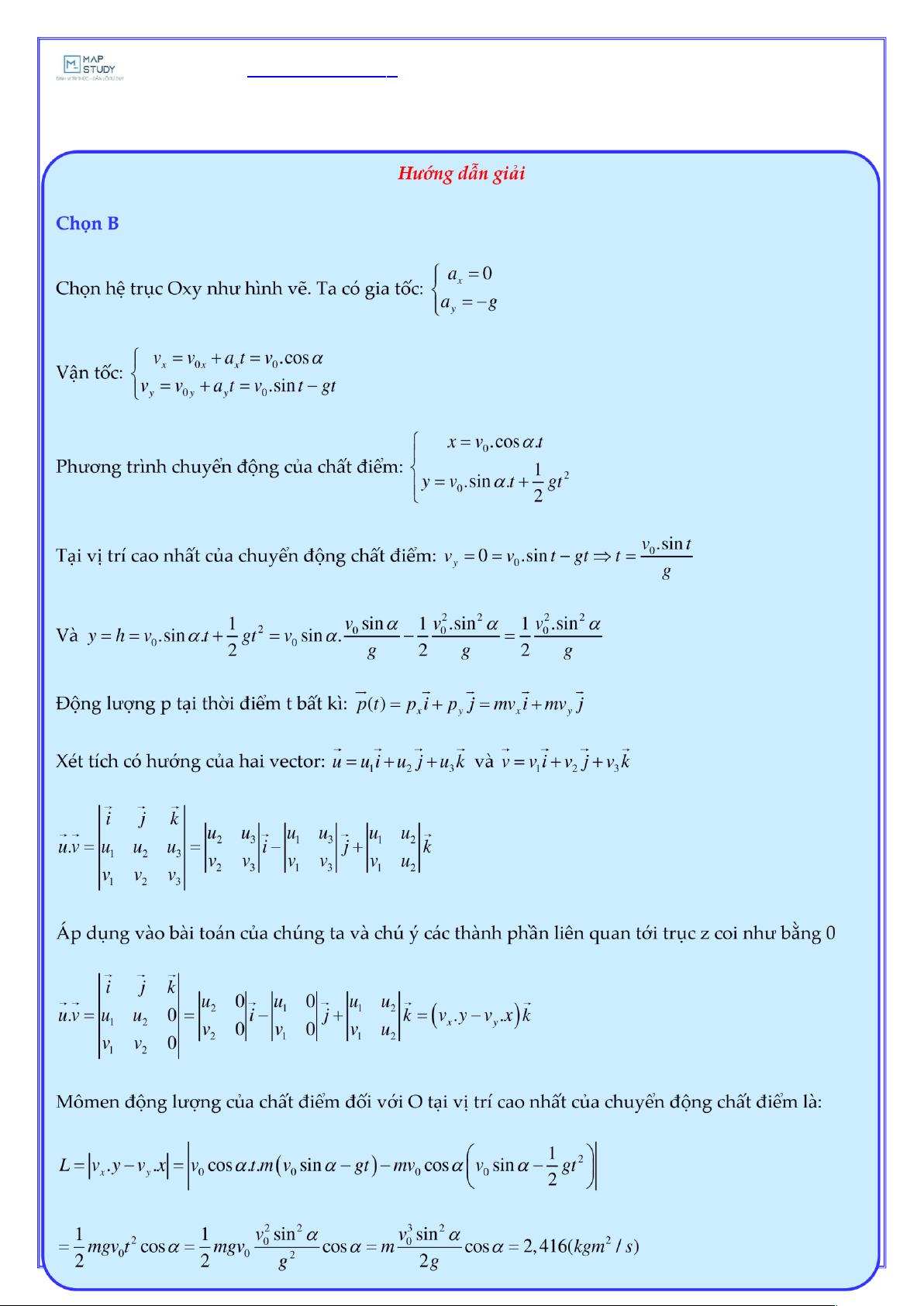 9,8(m s/ 2). M men động lượng của chất điểm đối với O tại vị tr cao nhất của chuyển động chất điểm l : kgm2 kgm2 kgm2 kgm2 A. 3,226 B. 2,416 C. 2,956 D. 2,146 s s s s