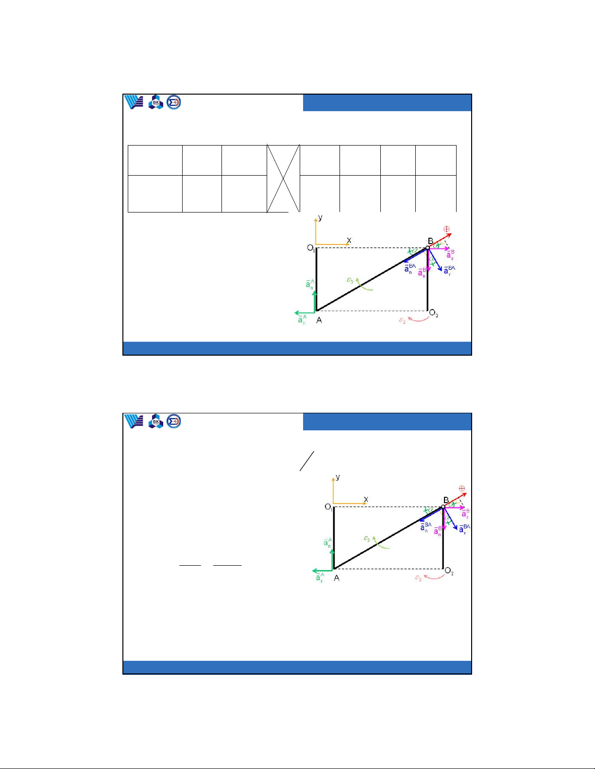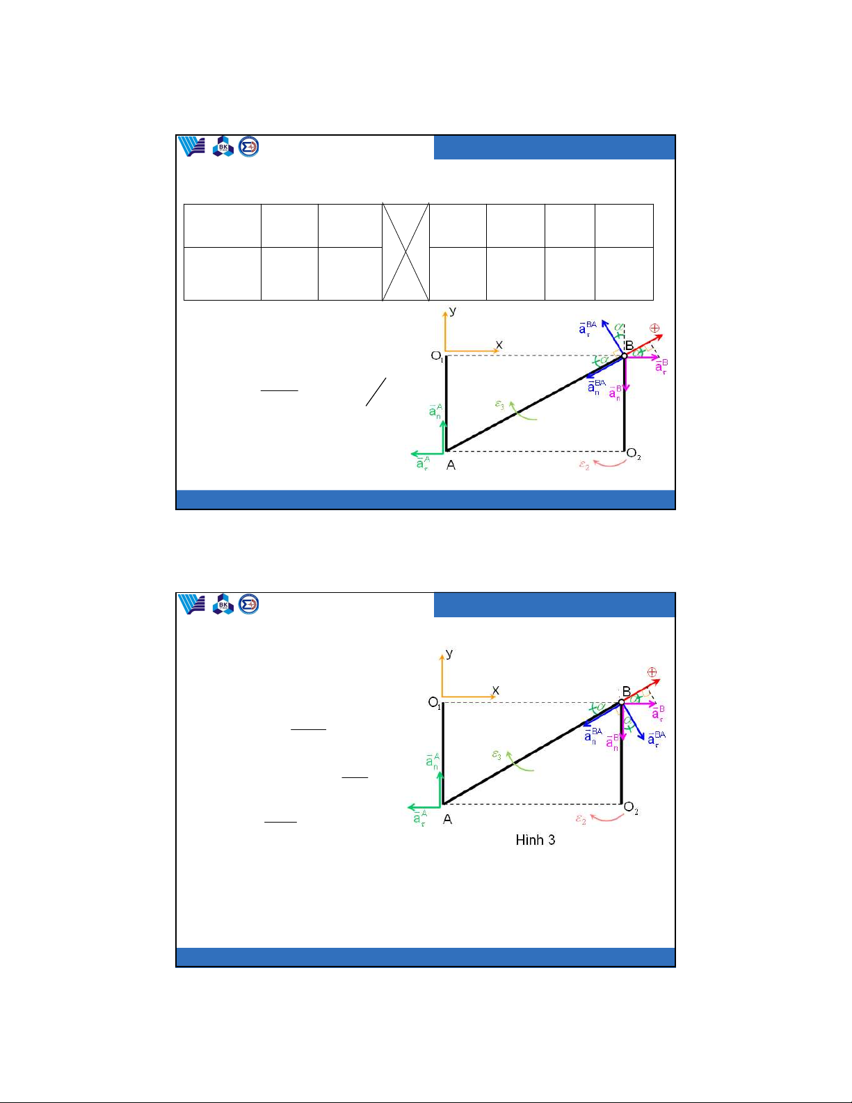 Trường đại học Bách Khoa Bộ môn Cơ kỹ thuật (3) : B B a a A A a a BA BA a a n n n Phương chiều O B AB 2 BO2 O A BA 1 AO1 2 2 .AB .O B Độ lớn ? 3 2 4m/s2 4m/s2 ? 2 2 2 2 2 m/s m/s 2