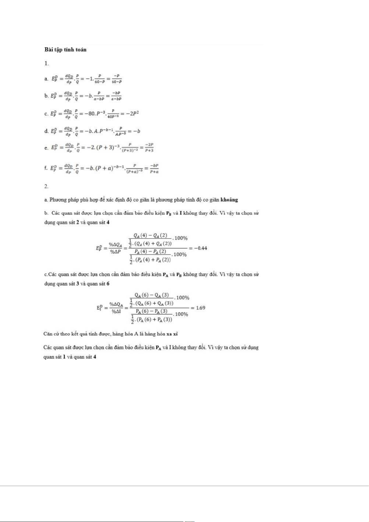Kết luận: P↑, Sự thay đổi của Q phụ thuộc vào mức độ thay đổi của cung và cầu Bài tập tính toán 1. a. 𝑄𝐷 = 100 - 𝑃 𝑄𝑆 = 10 + 𝑃 b.