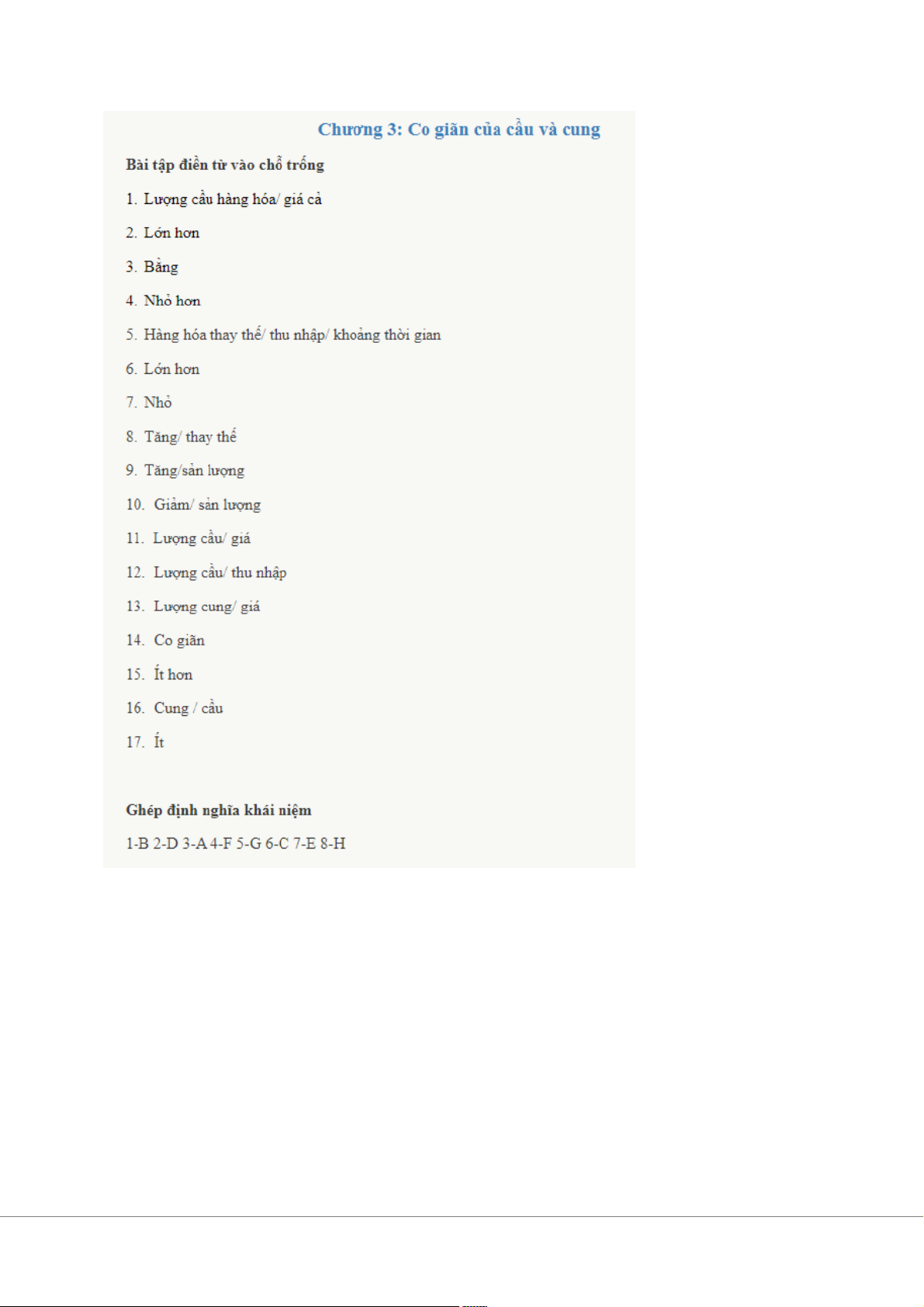 7. kỳ vọng/ công nghệ sản xuất 8. tăng/ sang phải 9. bổ sung 10. tăng 11. Đường cung/ phải 12. Cung/ giảm 13. Bằng 14. Lớn hơn/ dư thừa 15. Nhỏ hơn/ thiếu hụt 16. Cao hơn