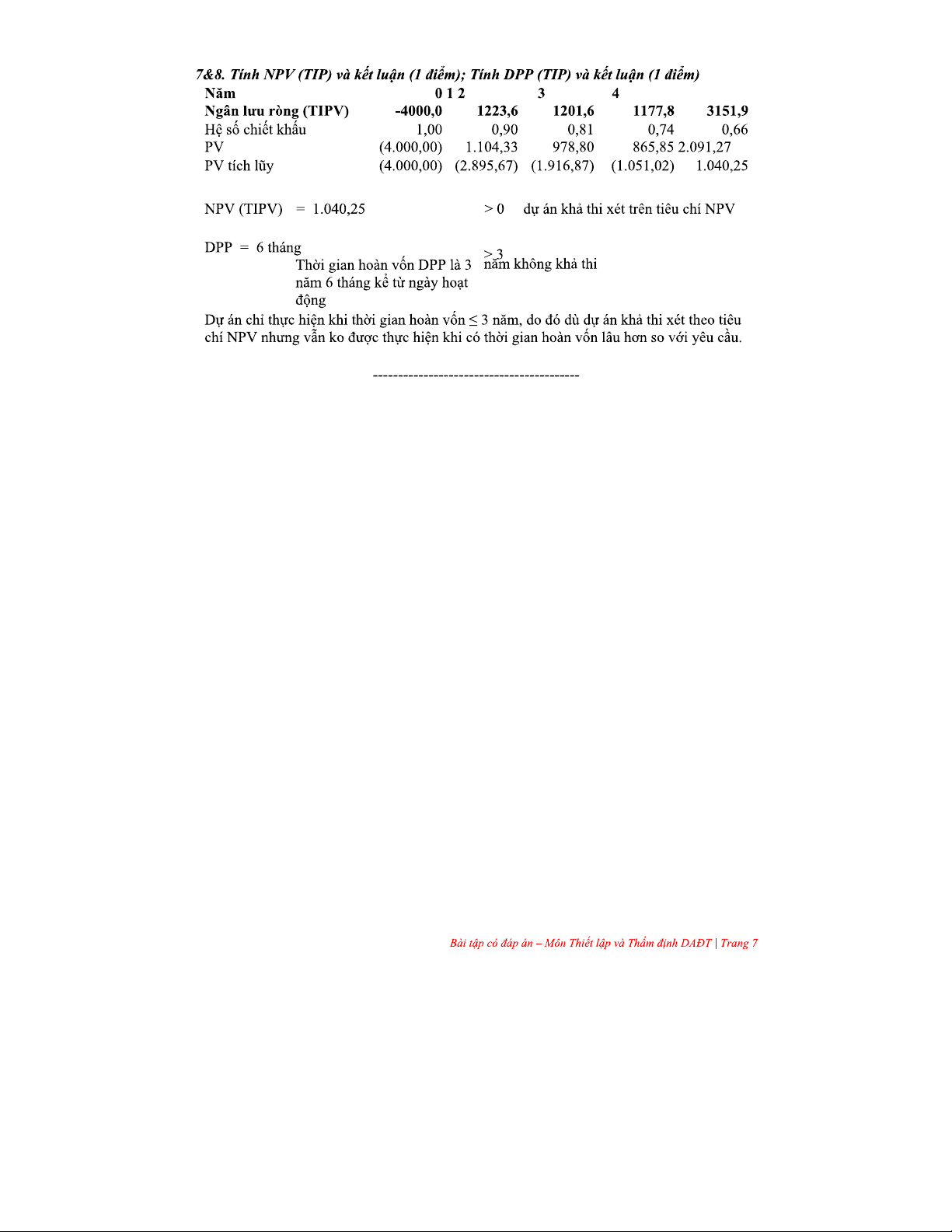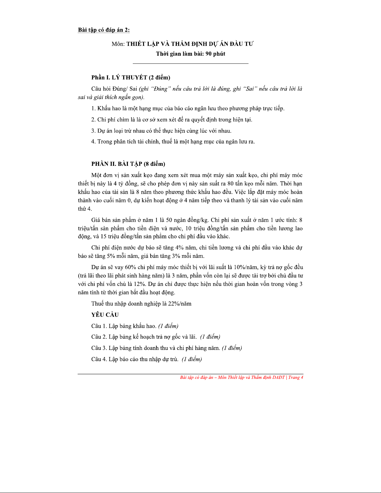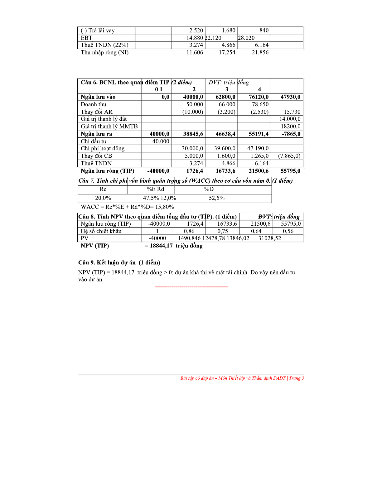 Bài Tập Có Đáp Án Môn THIẾT LẬP & THẨM ĐỊNH DỰ ÁN ĐẦU TƯ