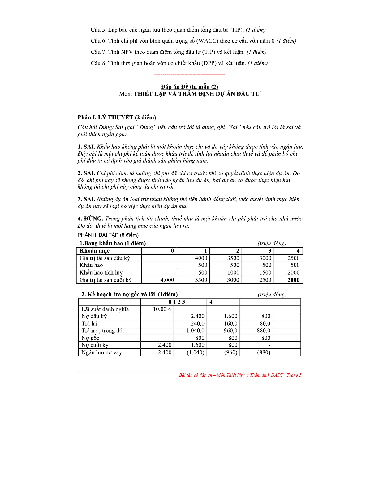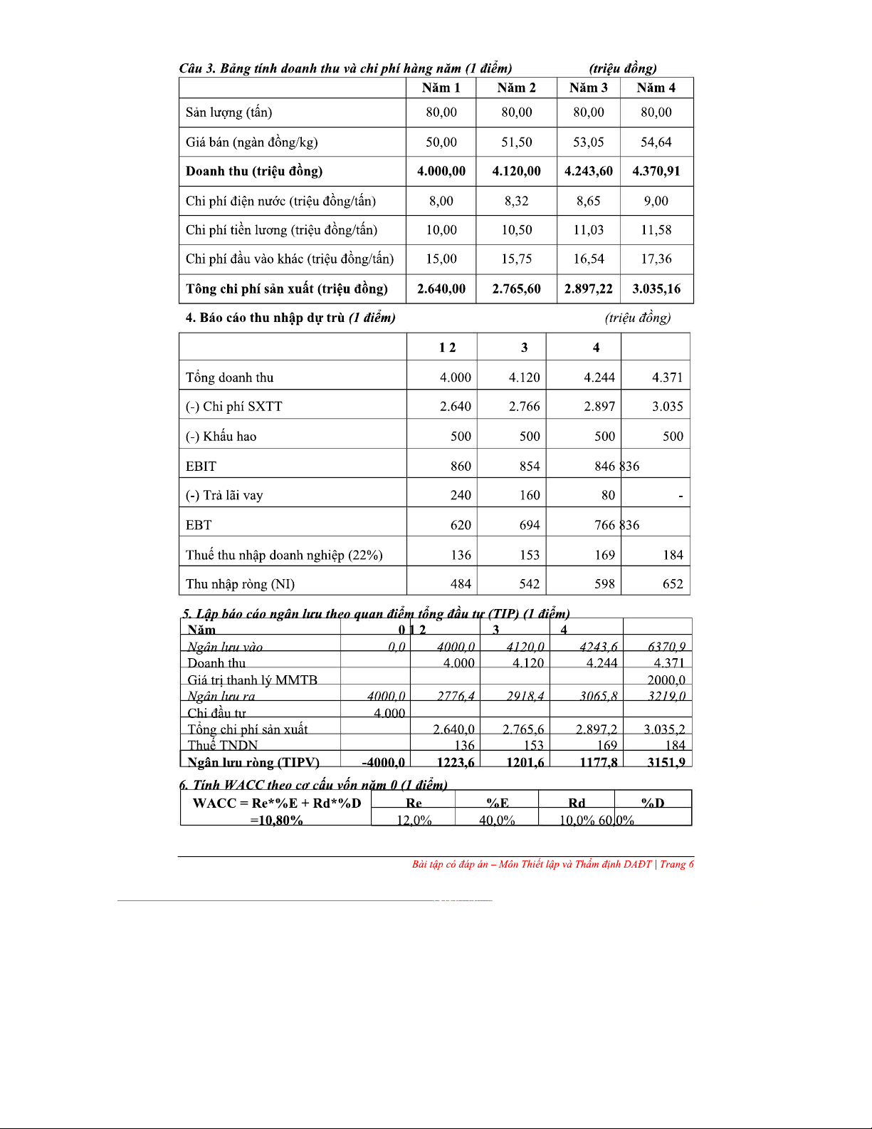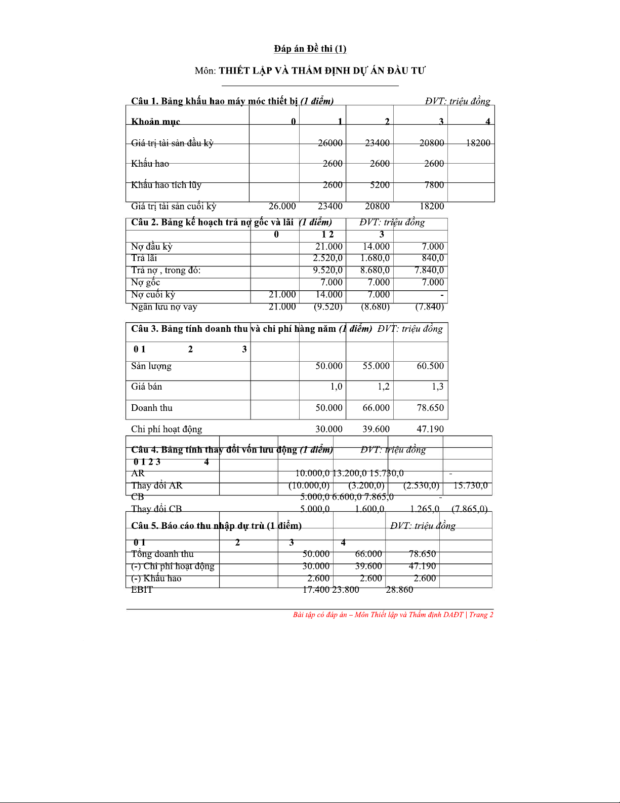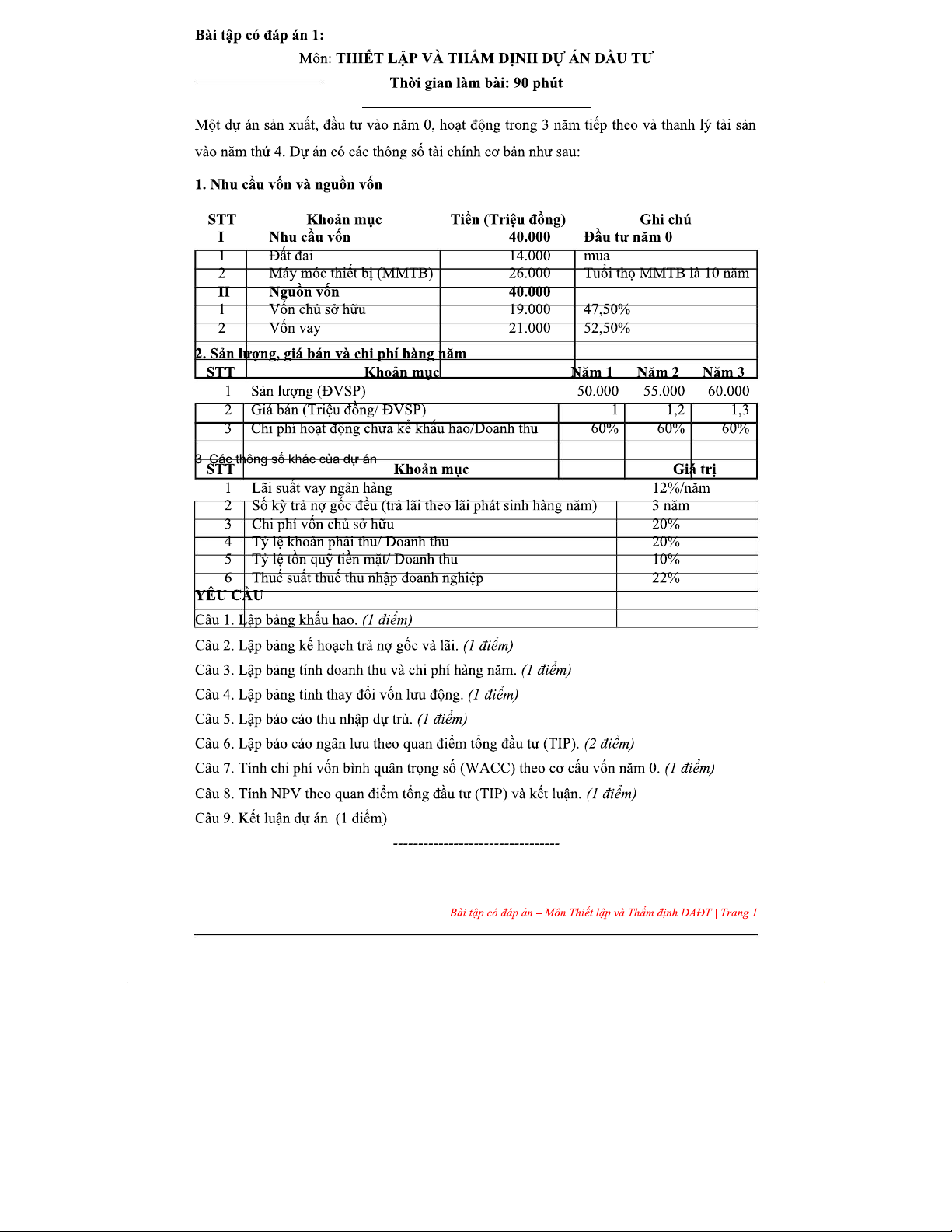 Bài Tập Có Đáp Án Môn THIẾT LẬP & THẨM ĐỊNH DỰ ÁN ĐẦU TƯ