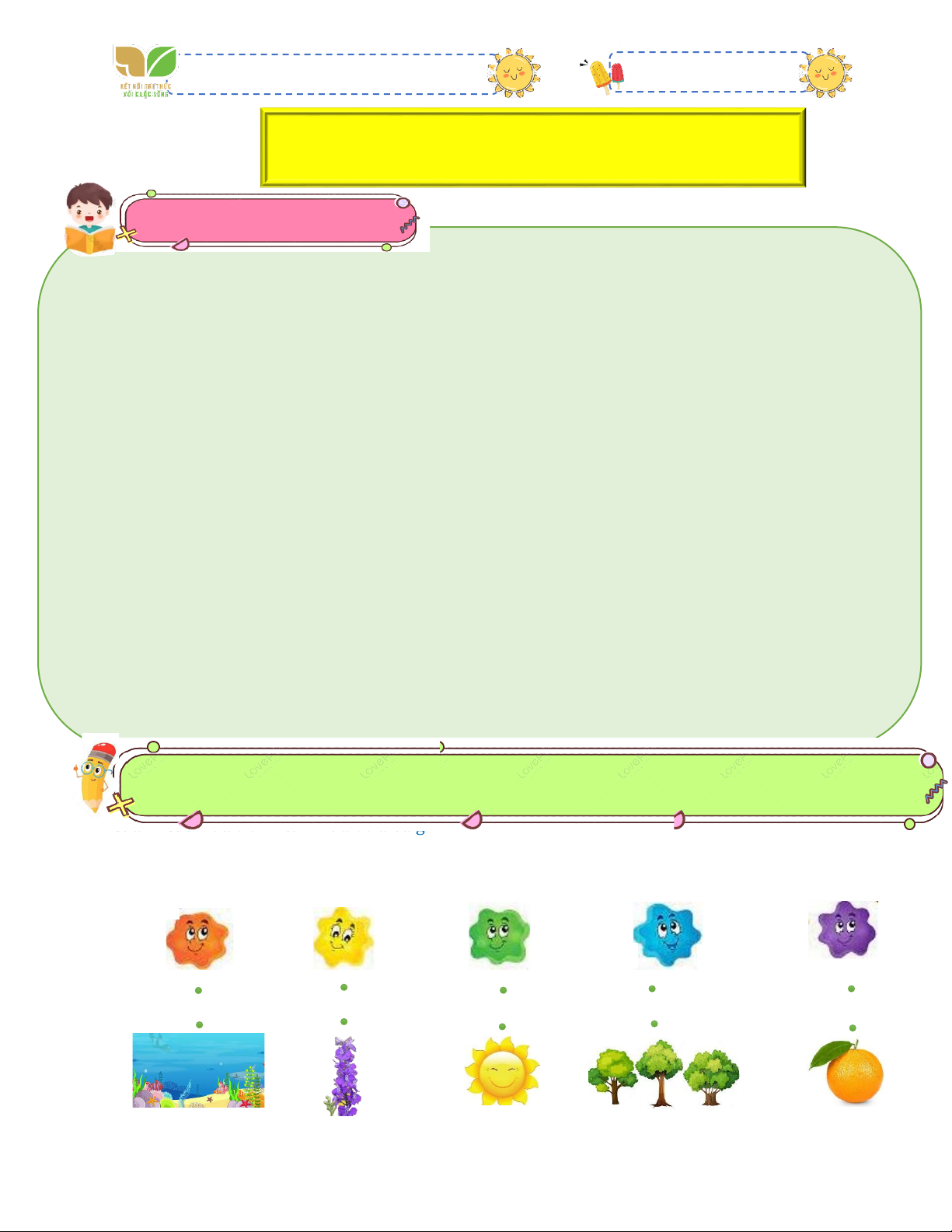 Câu 2. Nối màu sắc với sự vật tương ứng: Màu cam Màu vàng Màu xanh lục Màu xanh dương Màu tím Đại dương Hoa vi-ô-lét Mặt Trời Cây cối Quả cam Trang 1