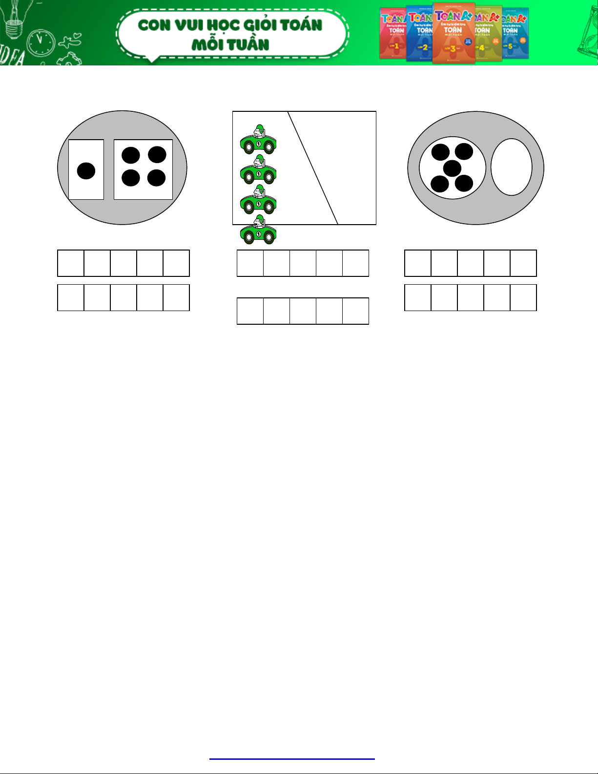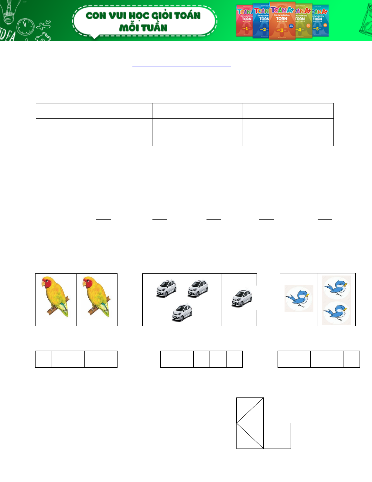 …… …… …… ……. …….. …….. Bài 3. Số? … + 3 = 5 2 + … = 4 1 + 4 + … = 5 1 + … = 5 … + 2 = 2 … + 2 + 1 = 4 Bài 4. >, <, =? 1 + 4 … 3 5 … 4 + 1 3 + 1 … 5 4 … 5 + 0 1 + 1 + 2 … 3 + 2 3 + 1 … 2 + 2 + 1 1 + 4 + 0 … 2 + 3 4 + 1 + 0 … 1 + 4 + 0