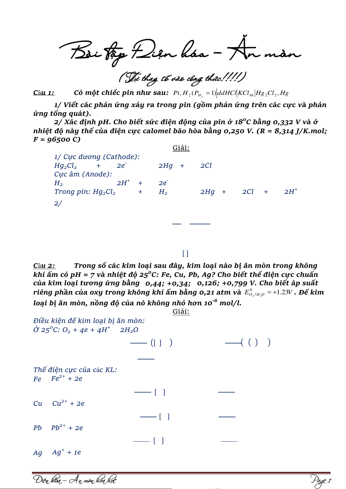 Pb ⇌ Pb2+ + 2e [ ] Ag ⇌ Ag+ + 1e Đi Đ ện hó n h a ó – Ăn mòn hóa họ c Page 1 g [ ]