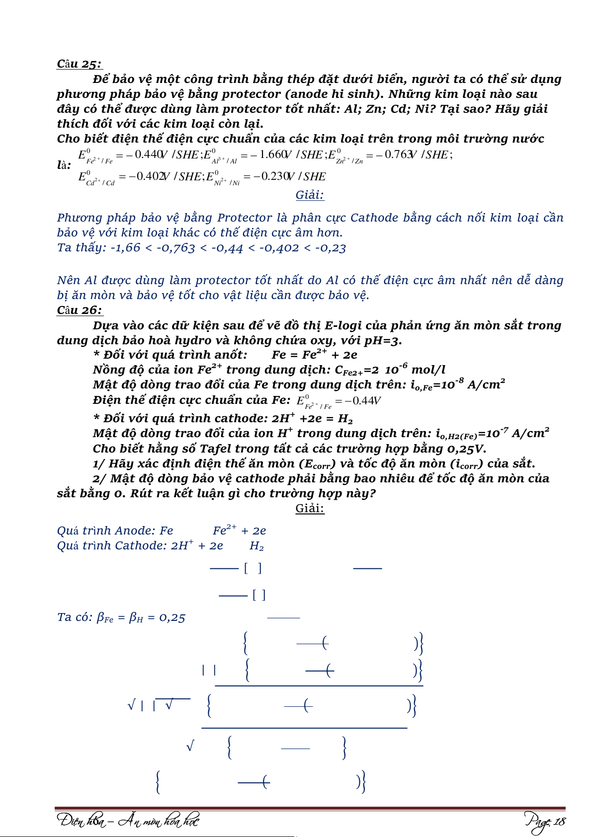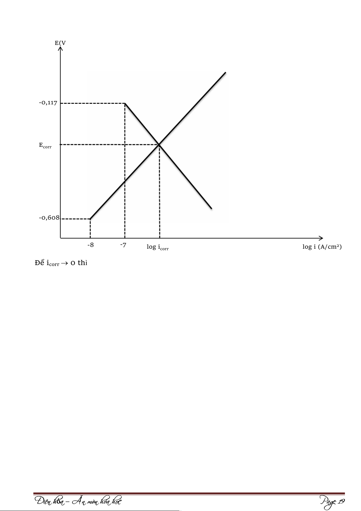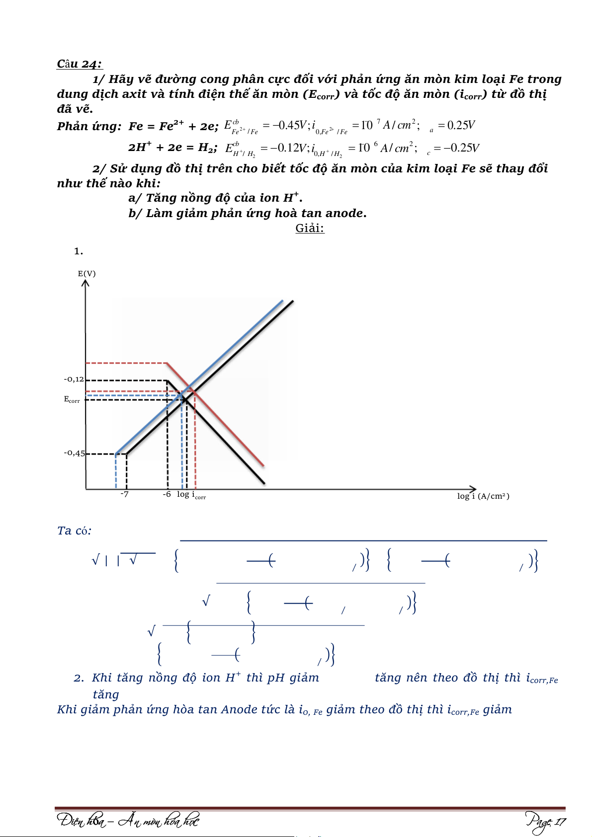 b/ Làm giảm phản ứng hoà tan anode. Giải: 1. E(V) -0,12 Ecorr -0,45 -7 -6 log i corr log i (A/cm2) Ta có: √ | | √ { ( )} { ( )} ⁄ ⁄ √ { )} ( ⁄ ⁄ √ { } { ( )} ⁄