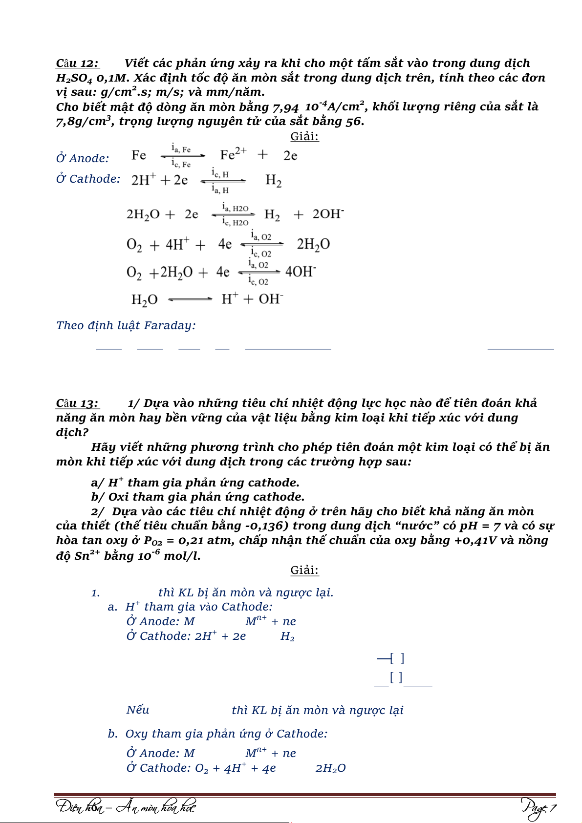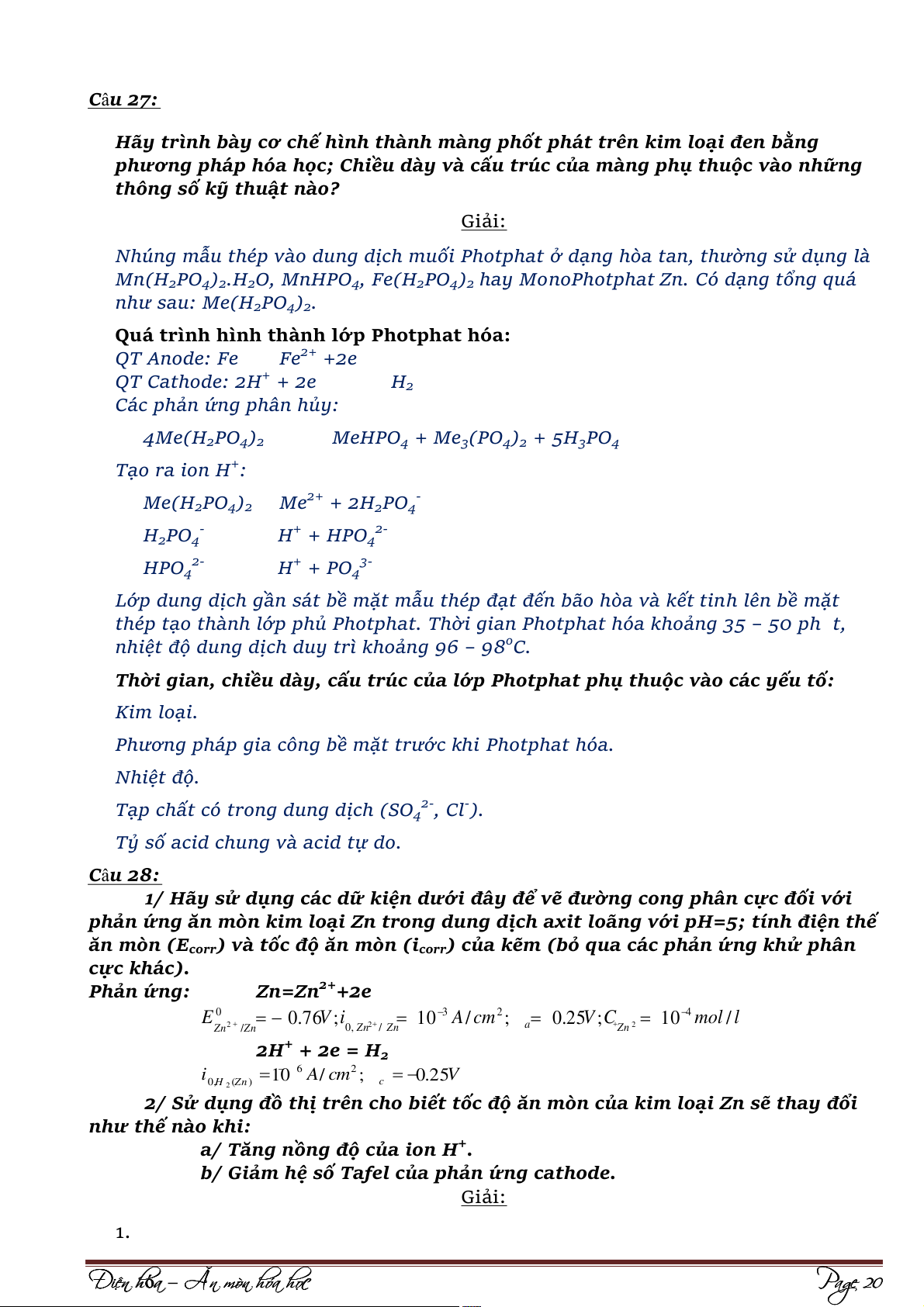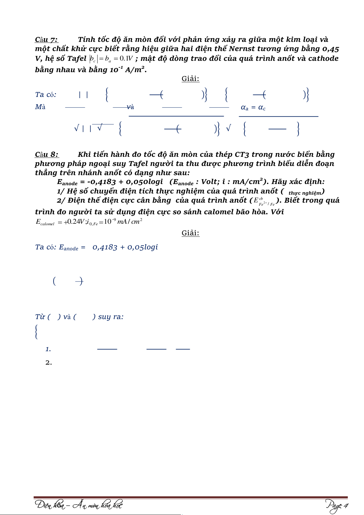 b/ Làm giảm phản ứng hoà tan anode. Giải: 1. E(V) -0,12 Ecorr -0,45 -7 -6 log i corr log i (A/cm2) Ta có: √ | | √ { ( )} { ( )} ⁄ ⁄ √ { )} ( ⁄ ⁄ √ { } { ( )} ⁄