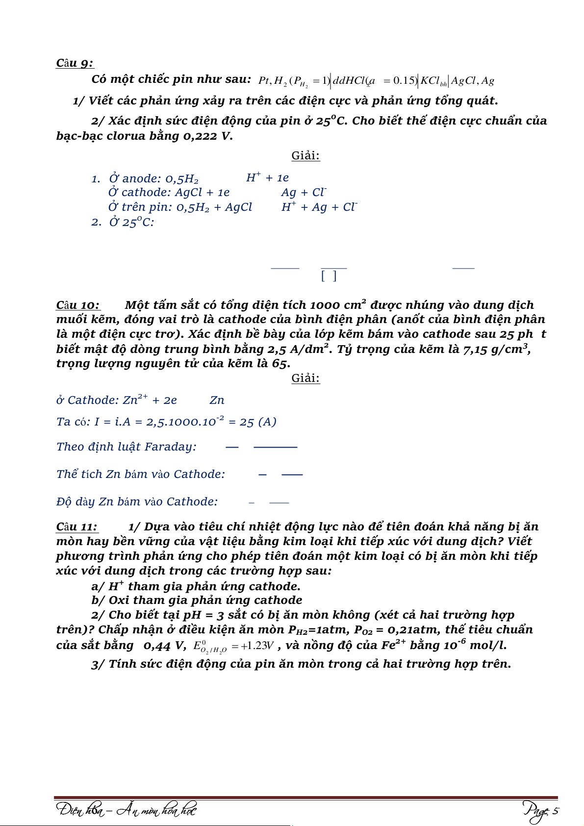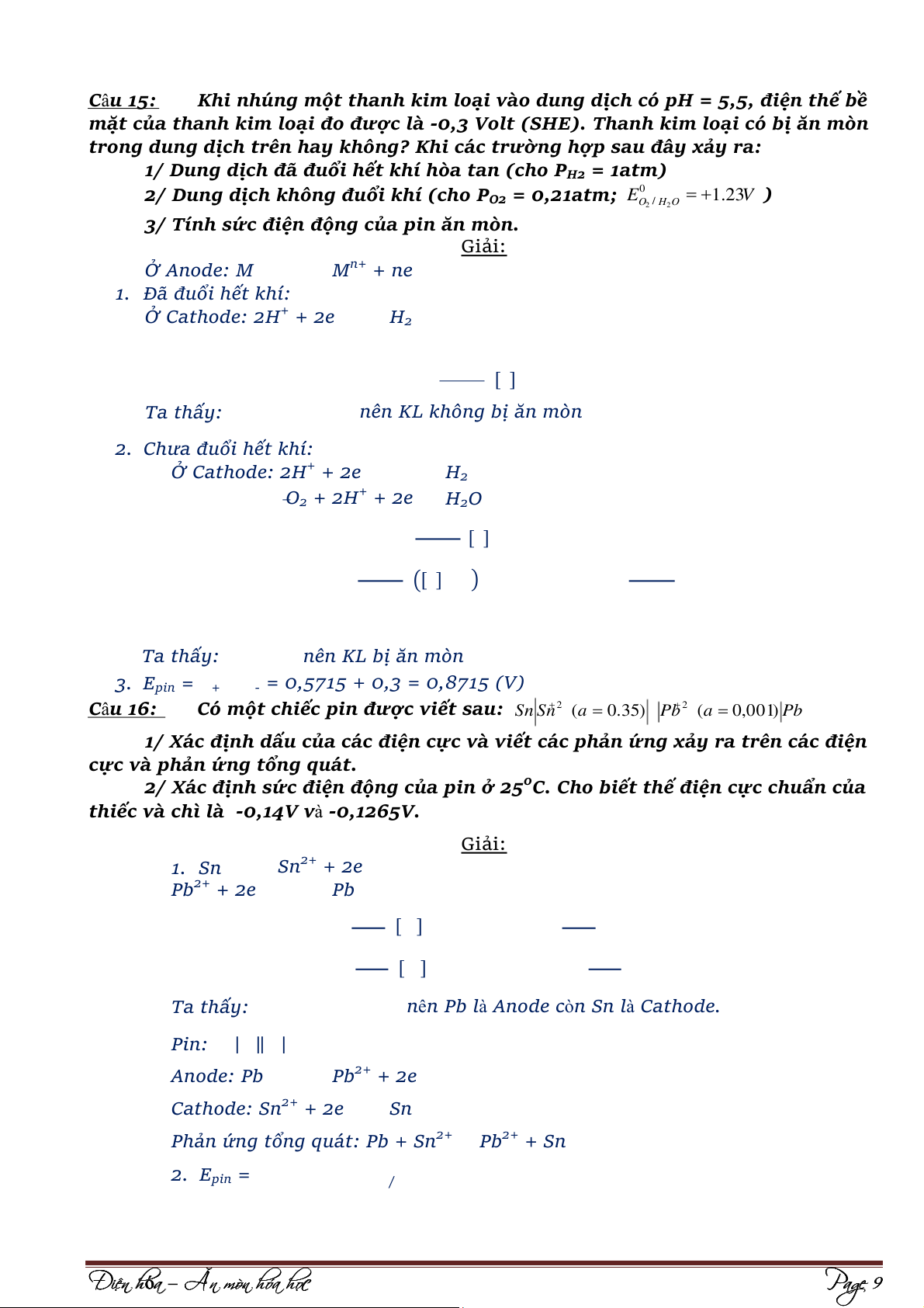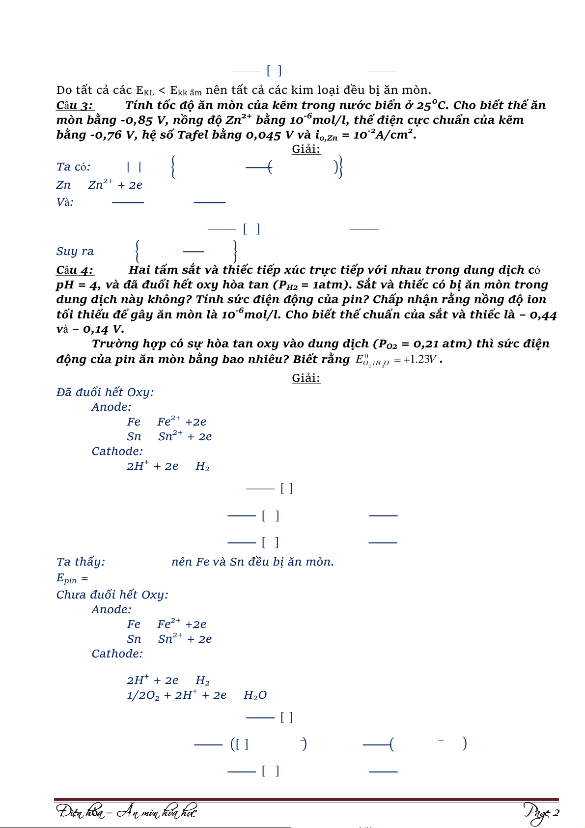 Chưa đuổi hết Oxy: Anode: Fe ⇌ Fe2+ +2e Sn ⇌ Sn2+ + 2e Cathode: 2H+ + 2e ⇌ H2 1/2O + ⇌ 2 + 2H + 2e H2O [ ] [ ] ) ) ( ( [ ] Đi Đ ện hó n h a ó – Ăn mòn hóa họ c Page 2 [ ] Epin =