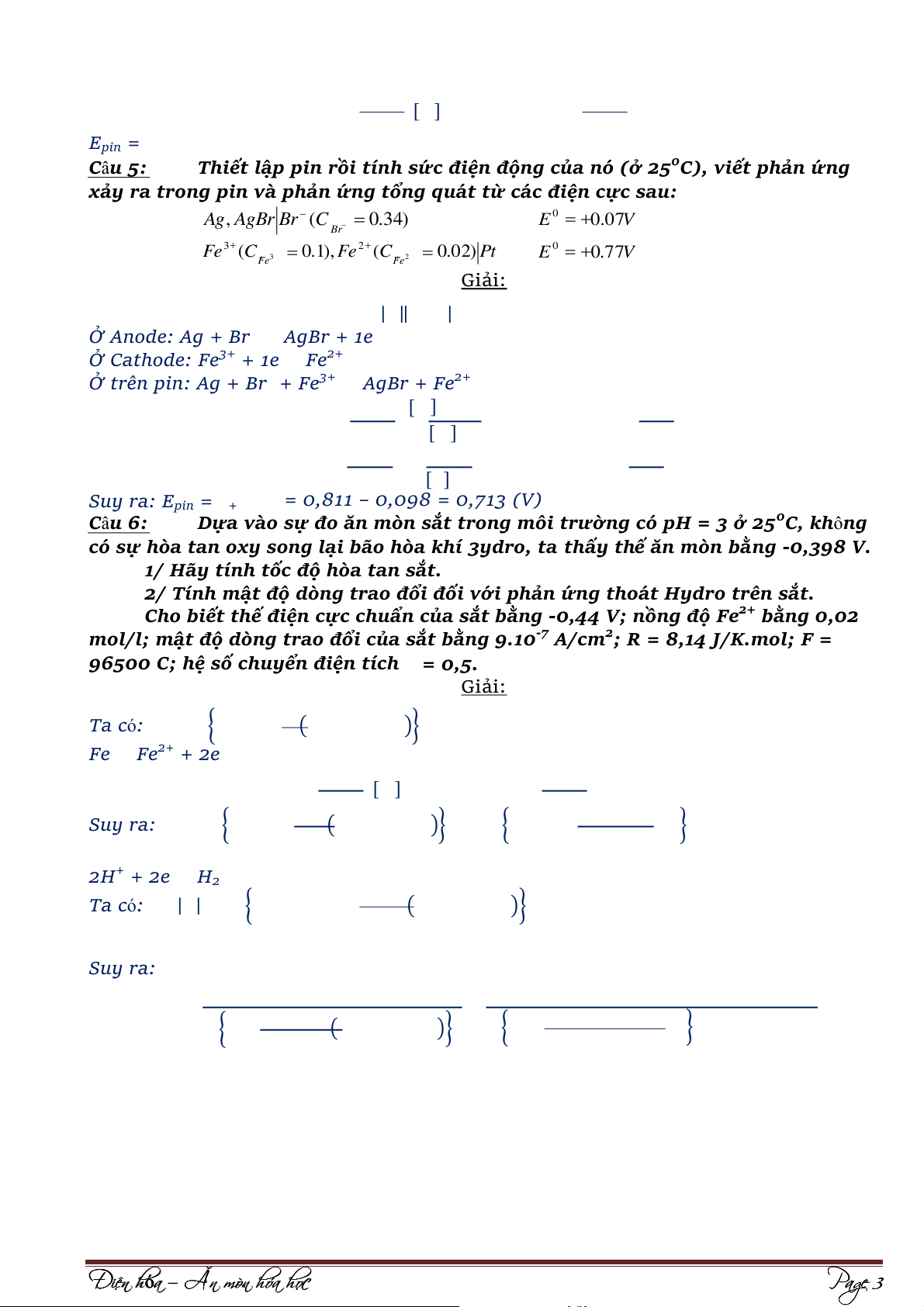xảy ra trong pin và phản ứng tổng quát từ các điện cực sau: Ag, AgBr Br (C E 0 0 0 . 7 . 0 3 ) 4 V Br Fe3 C ( 2 E 0 7 . 0 V 7 3 . 0 ) 1 , Fe C ( 2 0 . 0 ) 2 Pt Fe Fe Giải: | ‖ |
