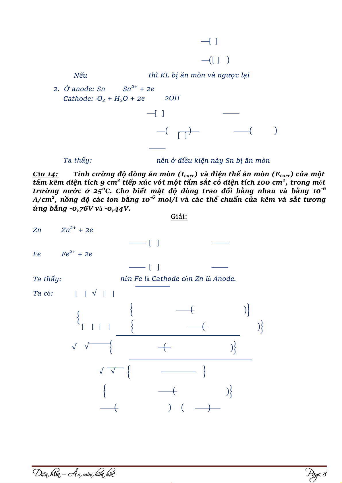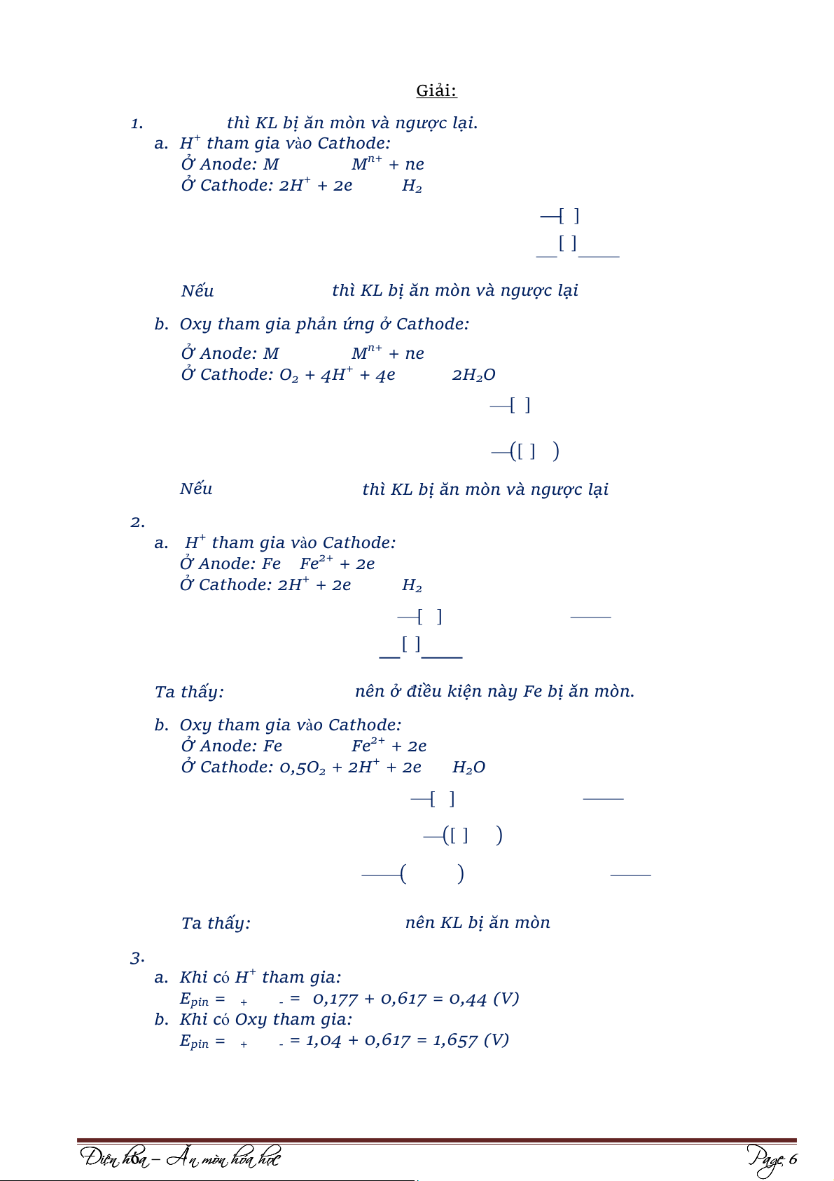 Đã đuổi hết Oxy: Anode: Fe ⇌ Fe2+ +2e Sn ⇌ Sn2+ + 2e Cathode: 2H+ + 2e ⇌ H2 [ ] [ ] [ ]