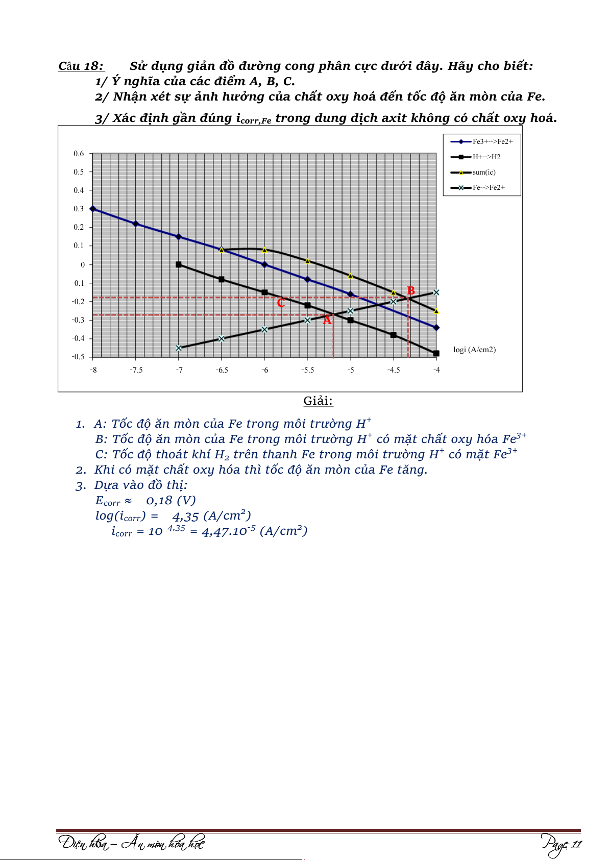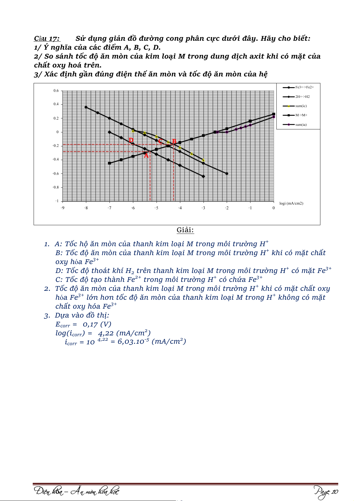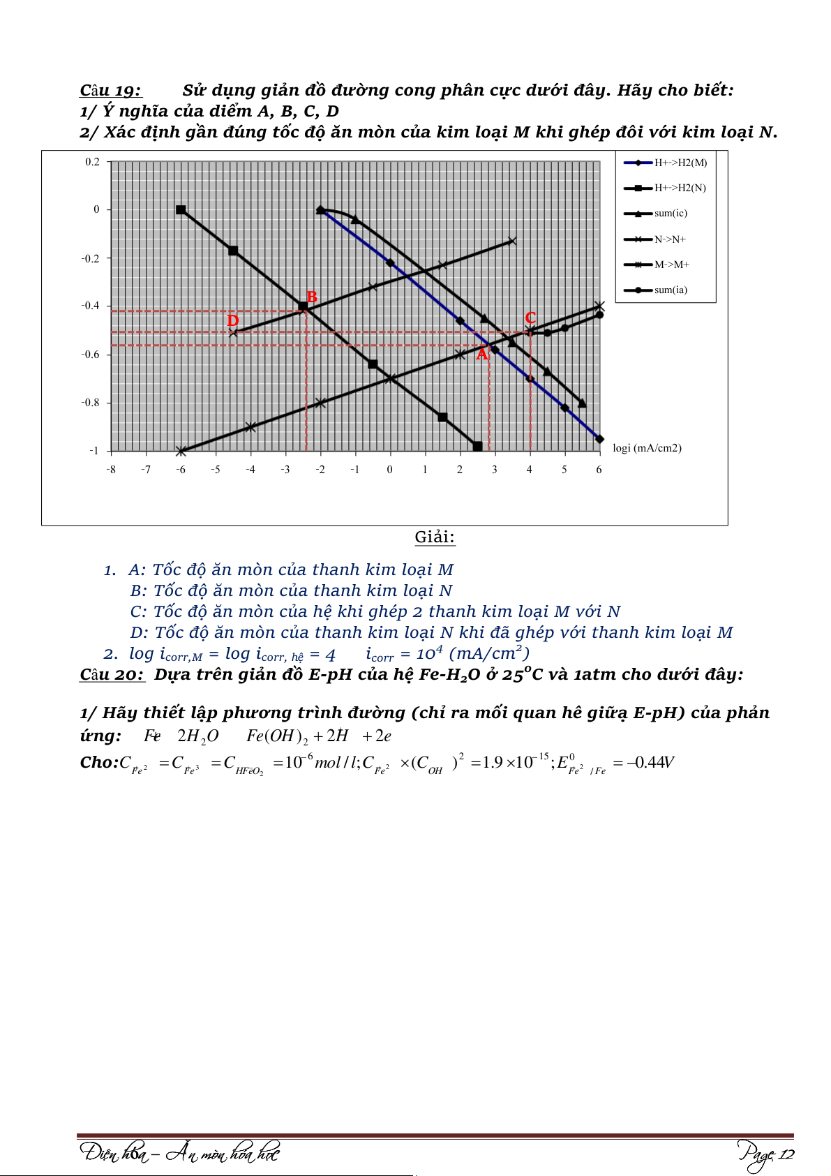 1/ Hãy vẽ đường cong phân cực đối với phản ứng ăn mòn kim loại Fe trong