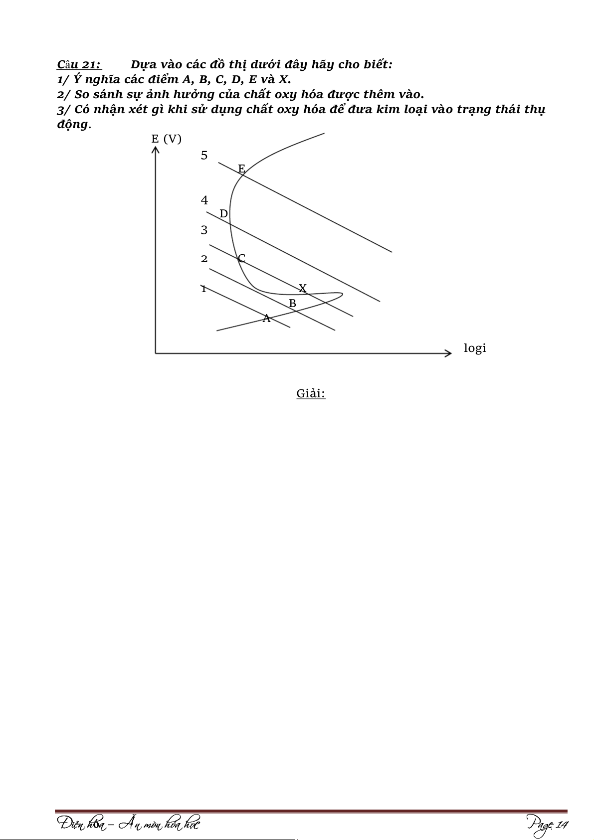 3/ Có nhận xét gì khi sử dụng chất oxy hóa để đưa kim loại vào trạng thái thụ động. E (V) 5 E 4 D 3 2 C 1 X B A logi Giải: Đi Đ ện hó n h a ó – Ăn mòn hóa họ c Page 14