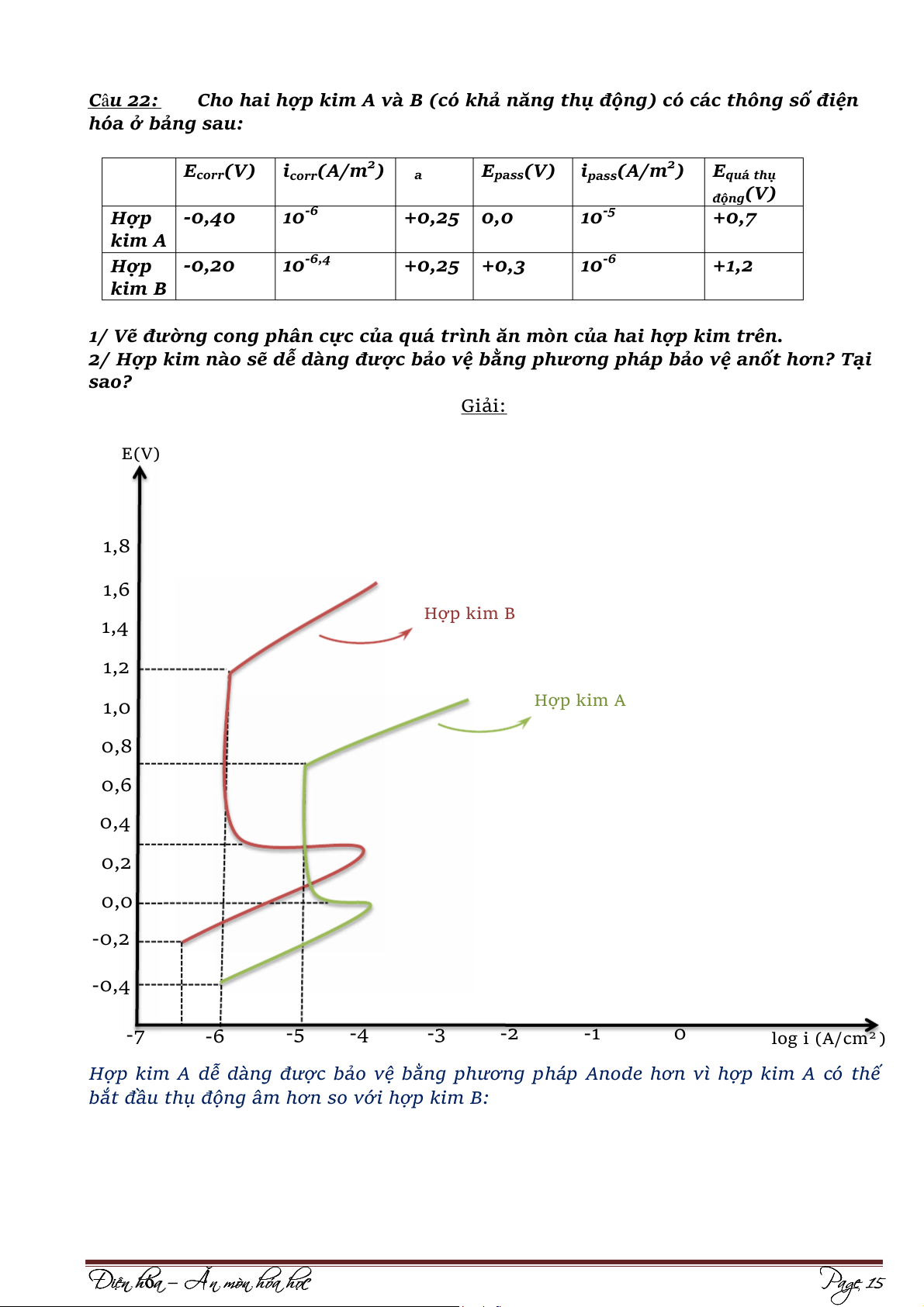 Cho hai hợp kim A và B (có khả năng thụ động) có các thông số điện hóa ở bảng sau: E 2 2 corr(V)