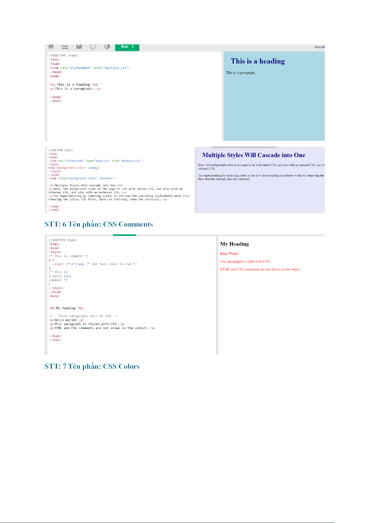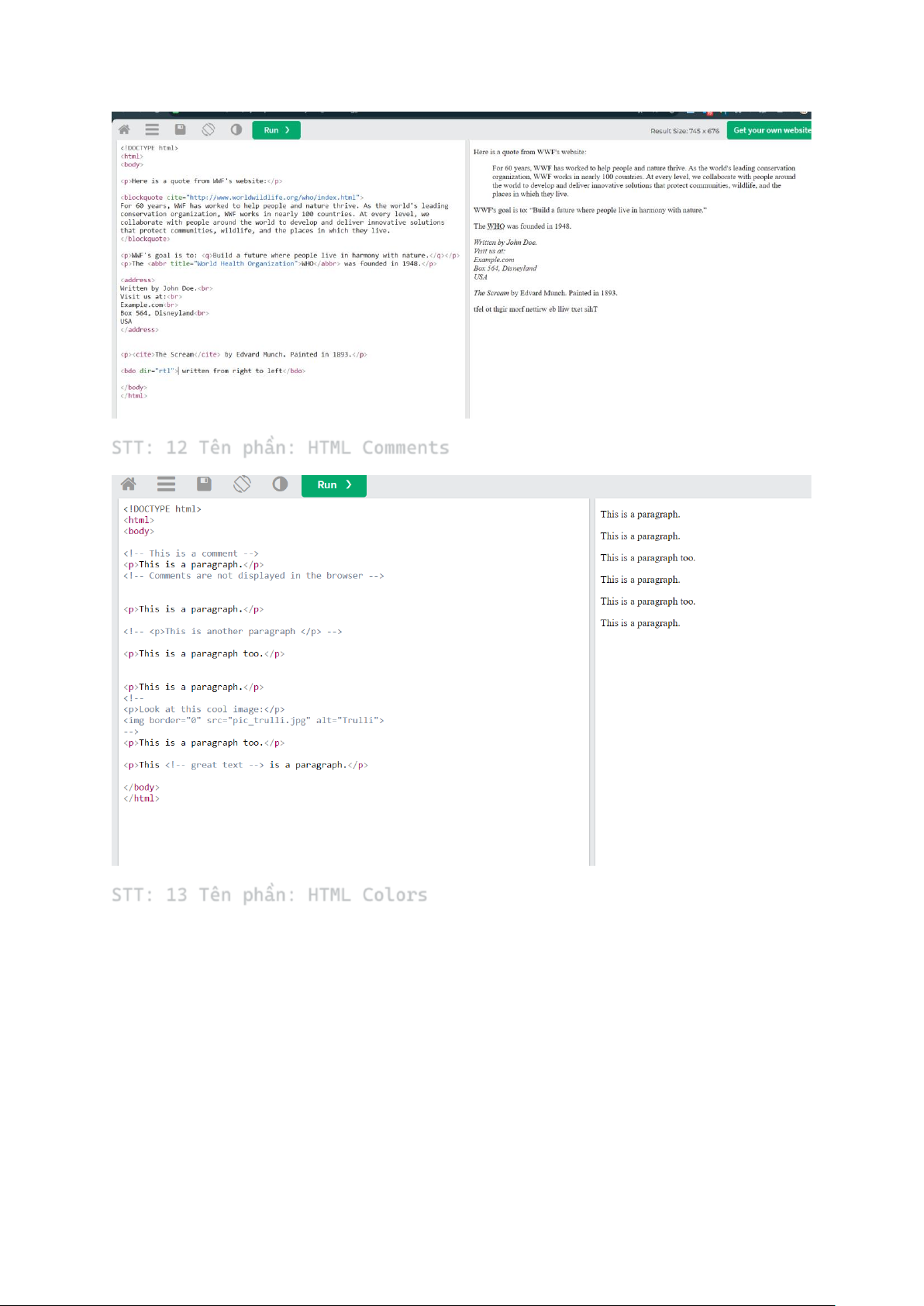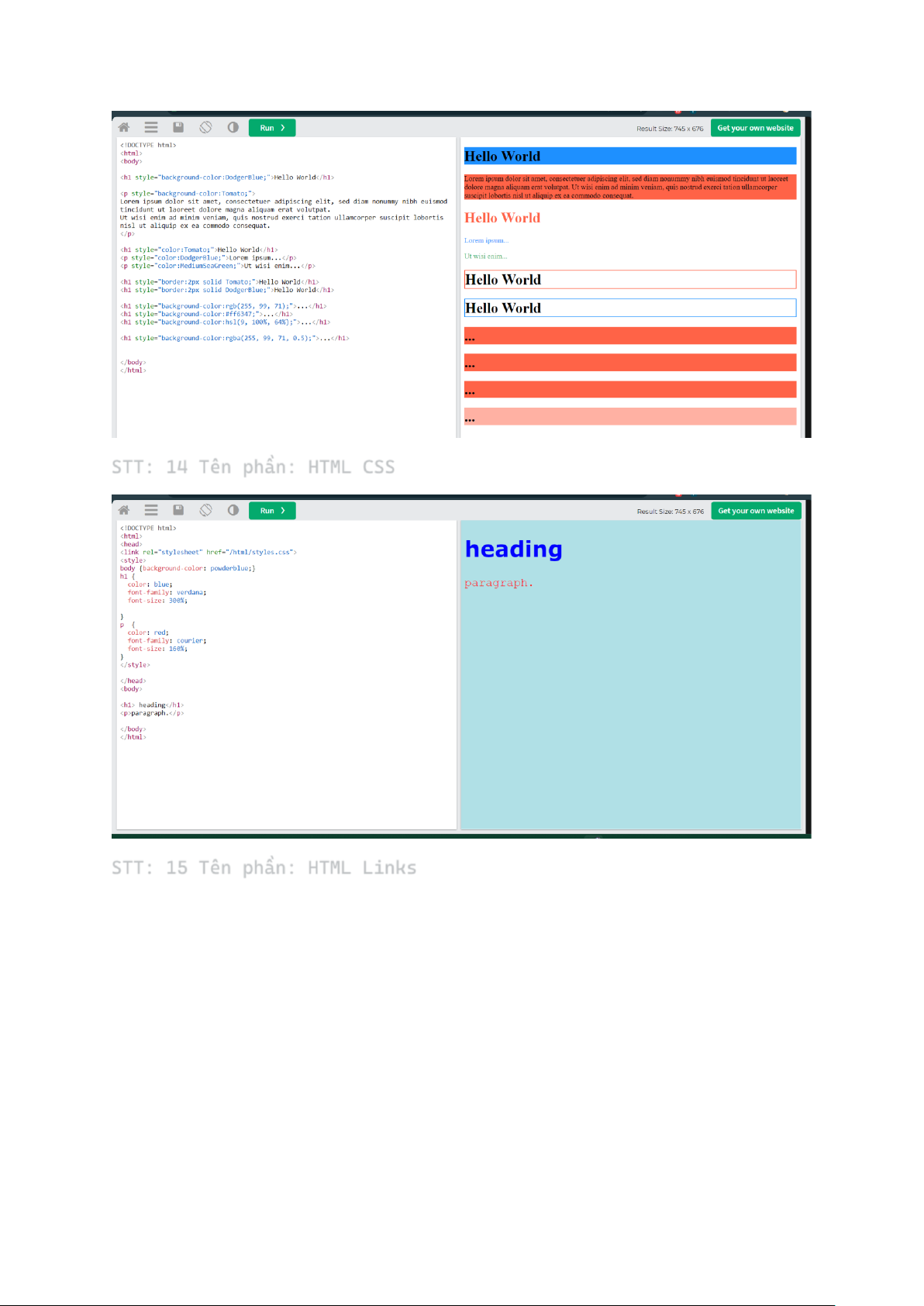 STT: 13 Tên phần: HTML Colors STT: 14 Tên phần: HTML CSS