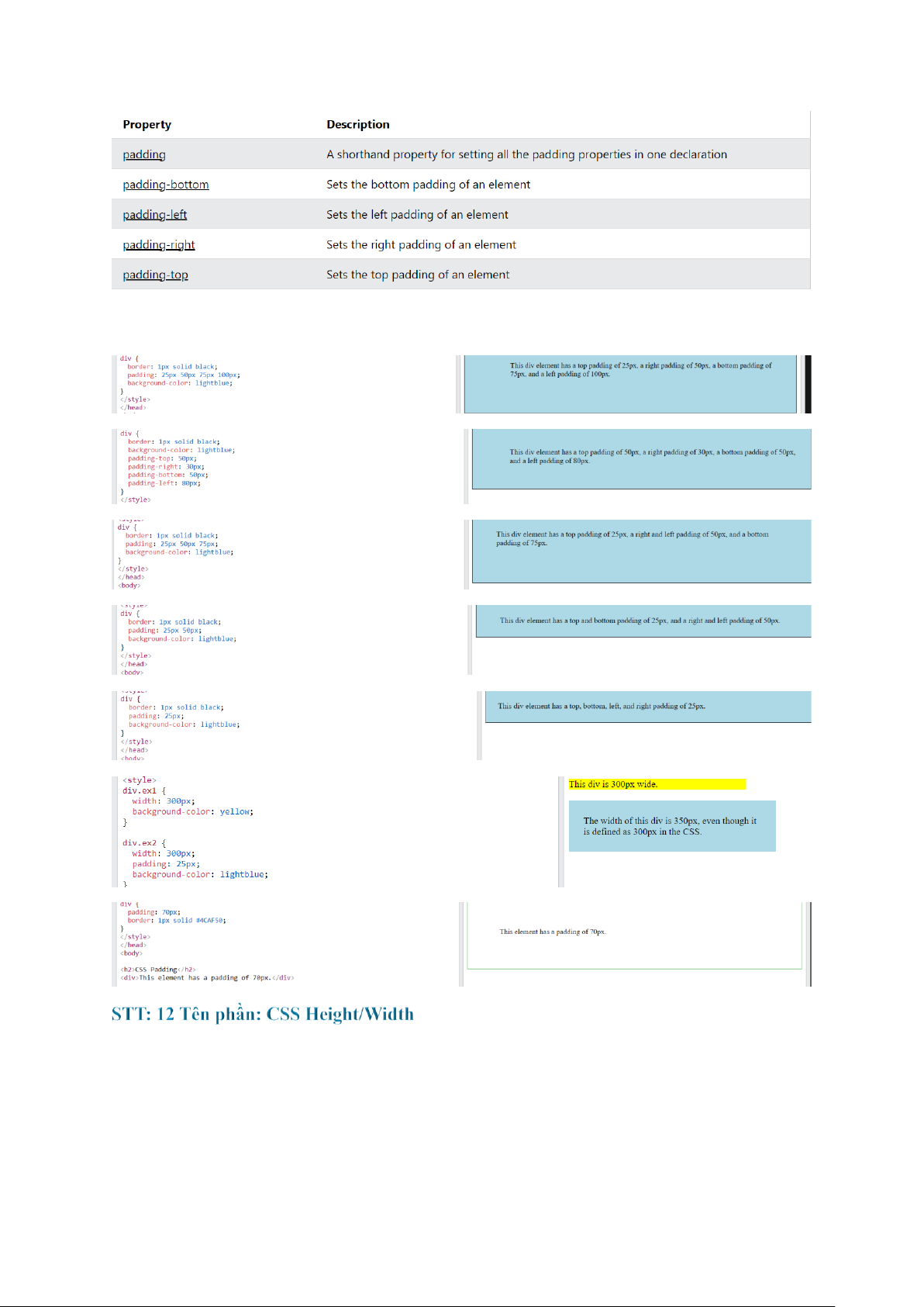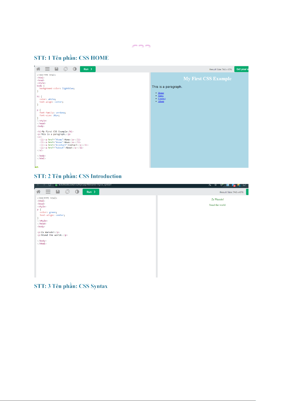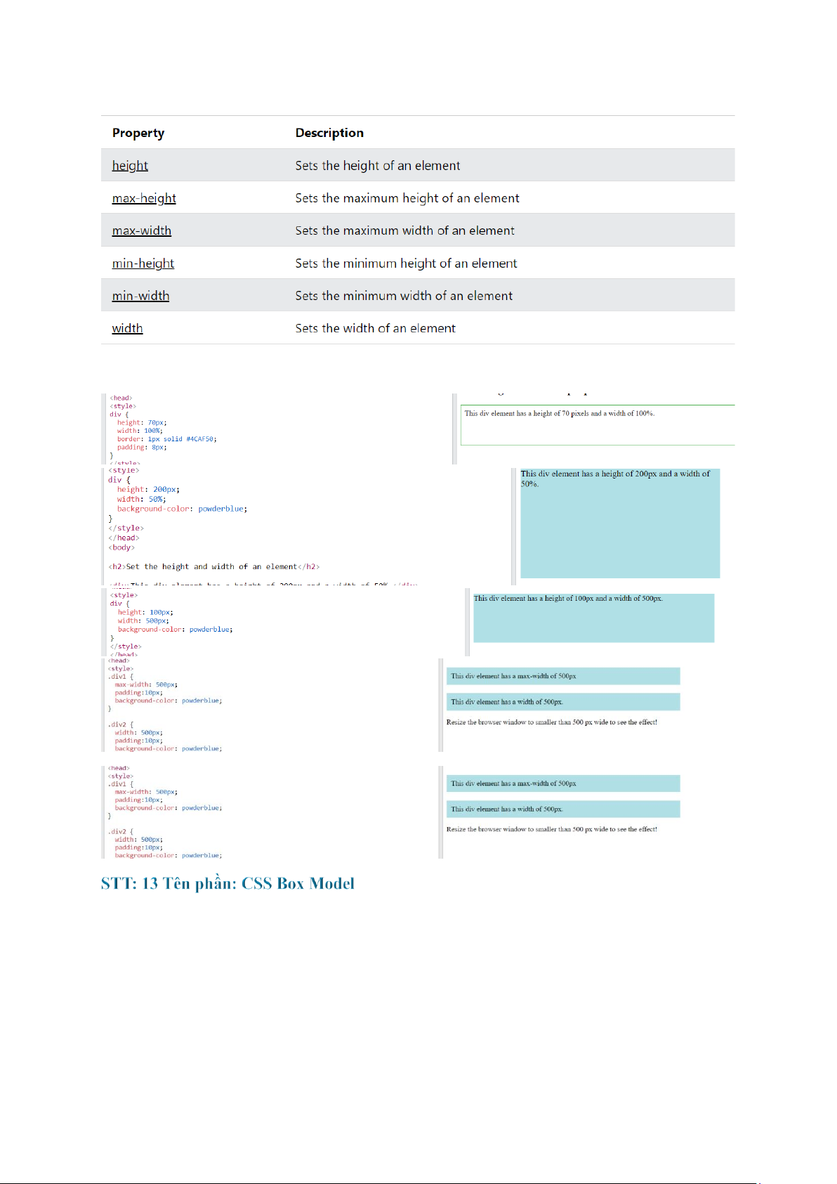 STT: 13 Tên phần: HTML Colors STT: 14 Tên phần: HTML CSS