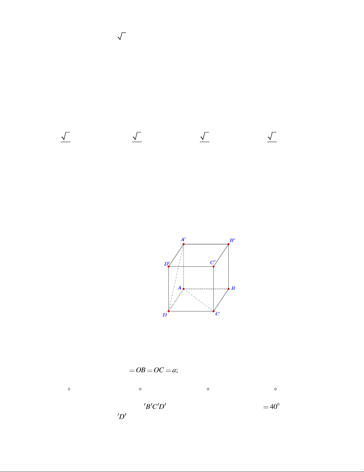 D A' B 'C ' D ', biết đáy ABCD là hình vuông. Tính góc giữa A'C và . BD B' C' A' D' C B A D A. 0 90 . B. 0 30 . C. 0 60 . D. 0 45 . Câu 6.
