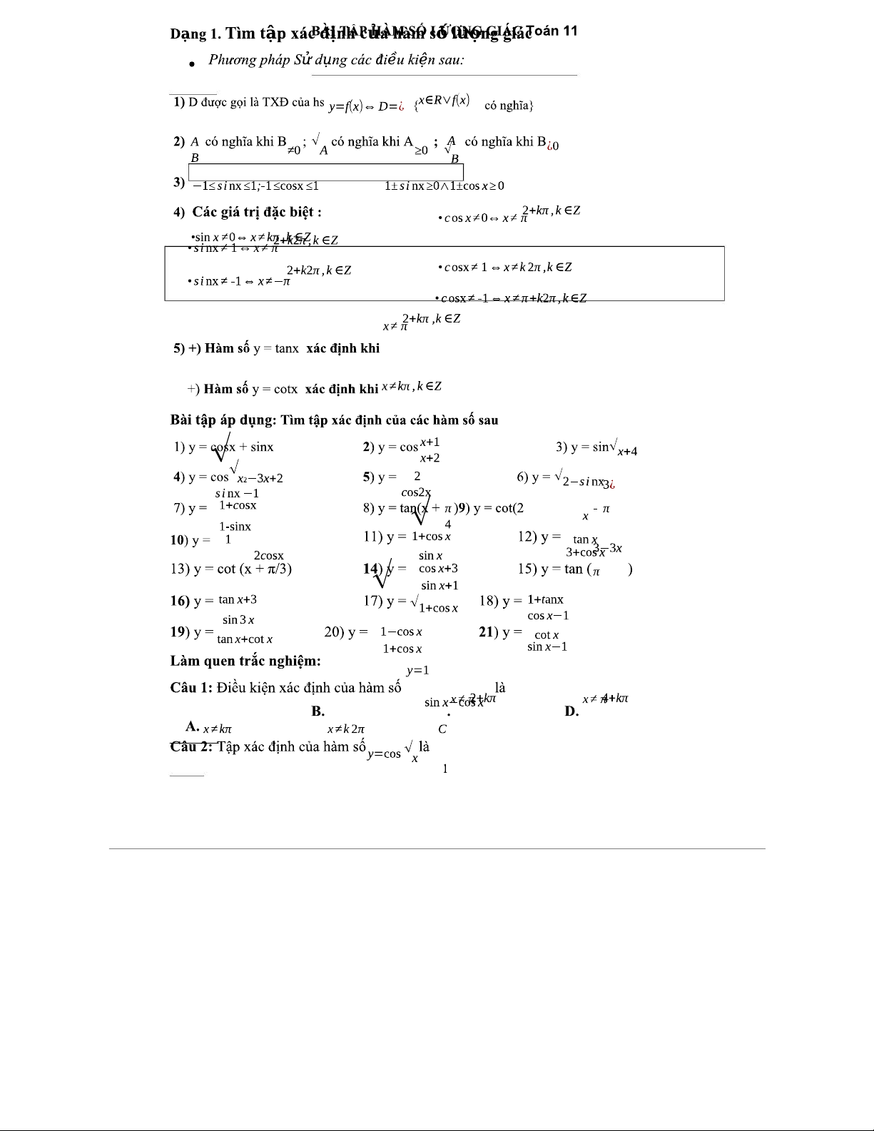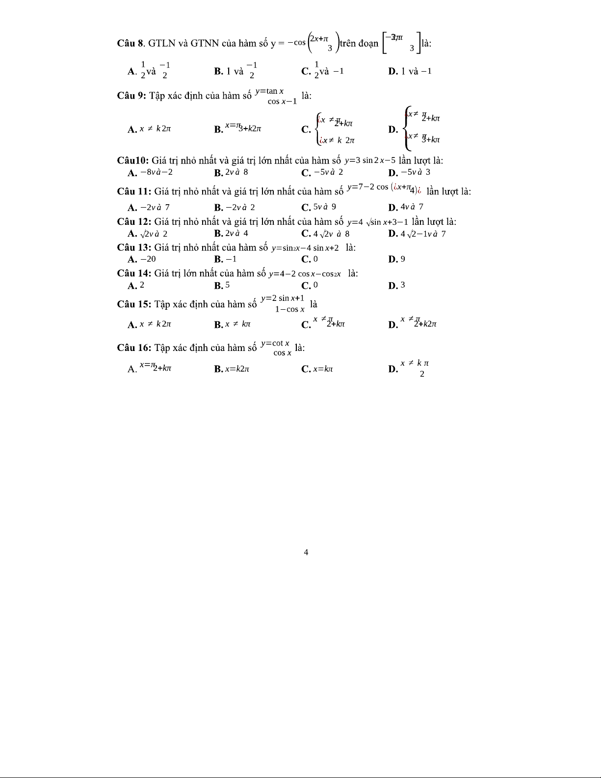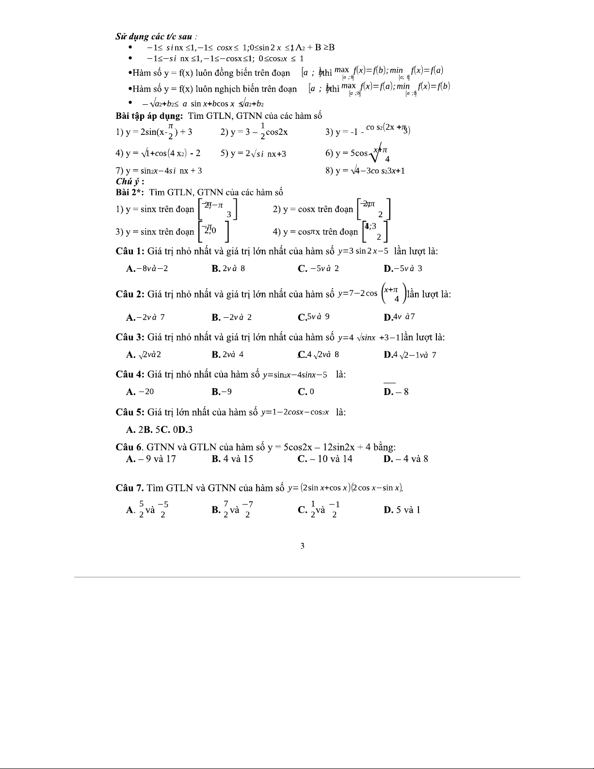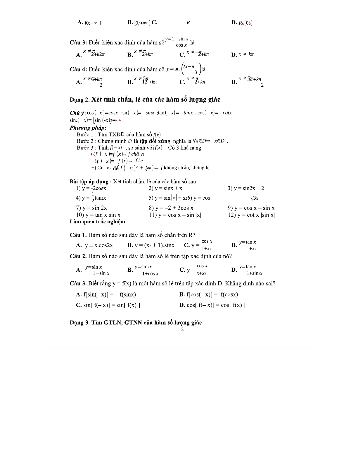 BÀI TẬP HÀM SỐ LƯỢNG GIÁC Toán 11: Tìm TXĐ, Tính Chẵn Lẻ, GTLN-GTNN
