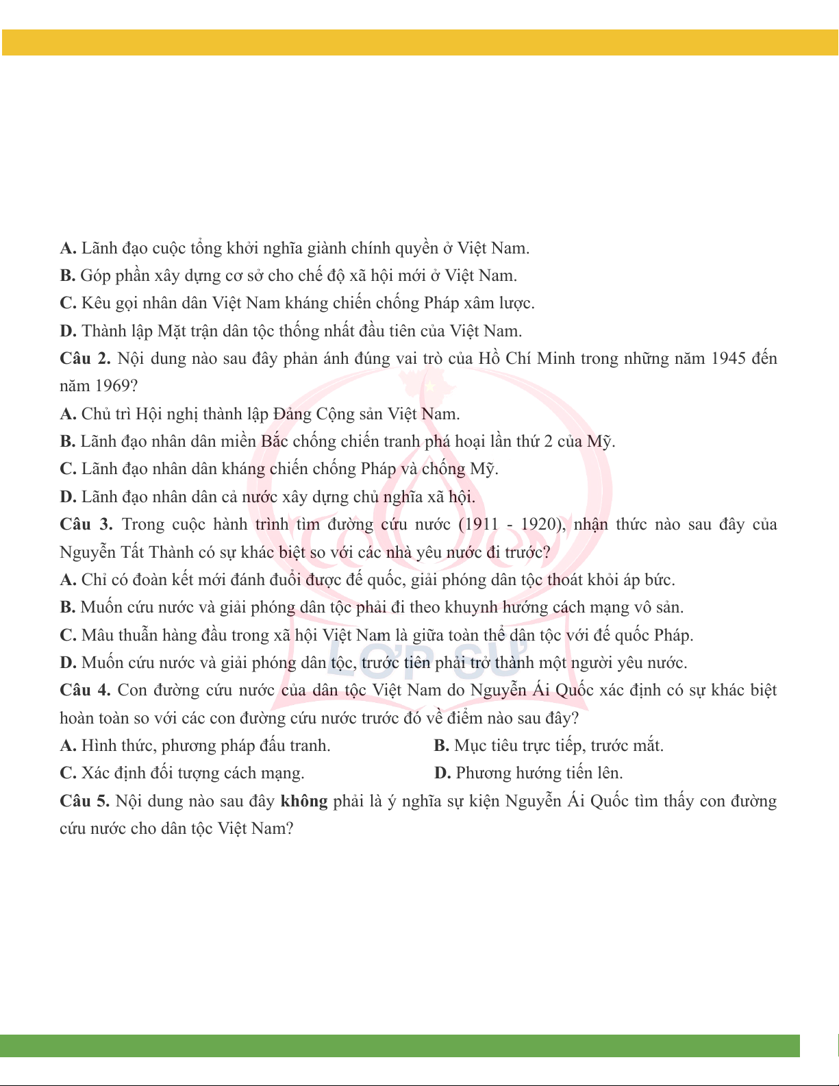 Câu 2. Nội dung nào sau đây phản ánh đúng vai trò của Hồ Chí Minh trong những năm 1945 đến năm 1969?