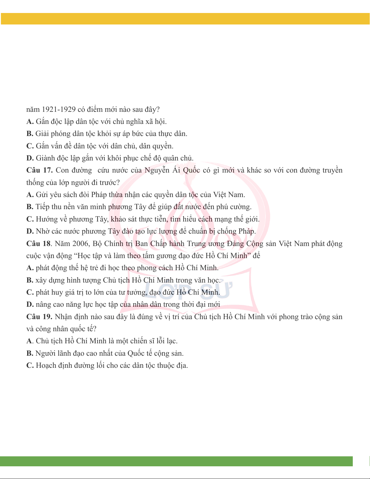 Câu 16. Lý luận giải phóng dân tộc của Nguyễn Ái Quốc được truyền bá vào Việt Nam trong những
