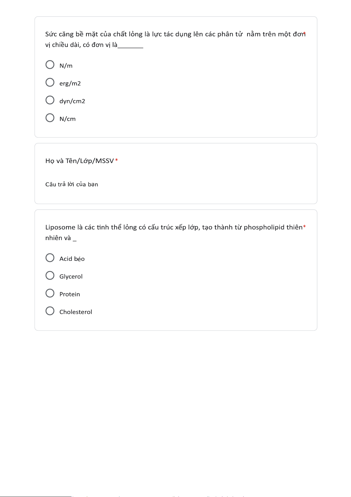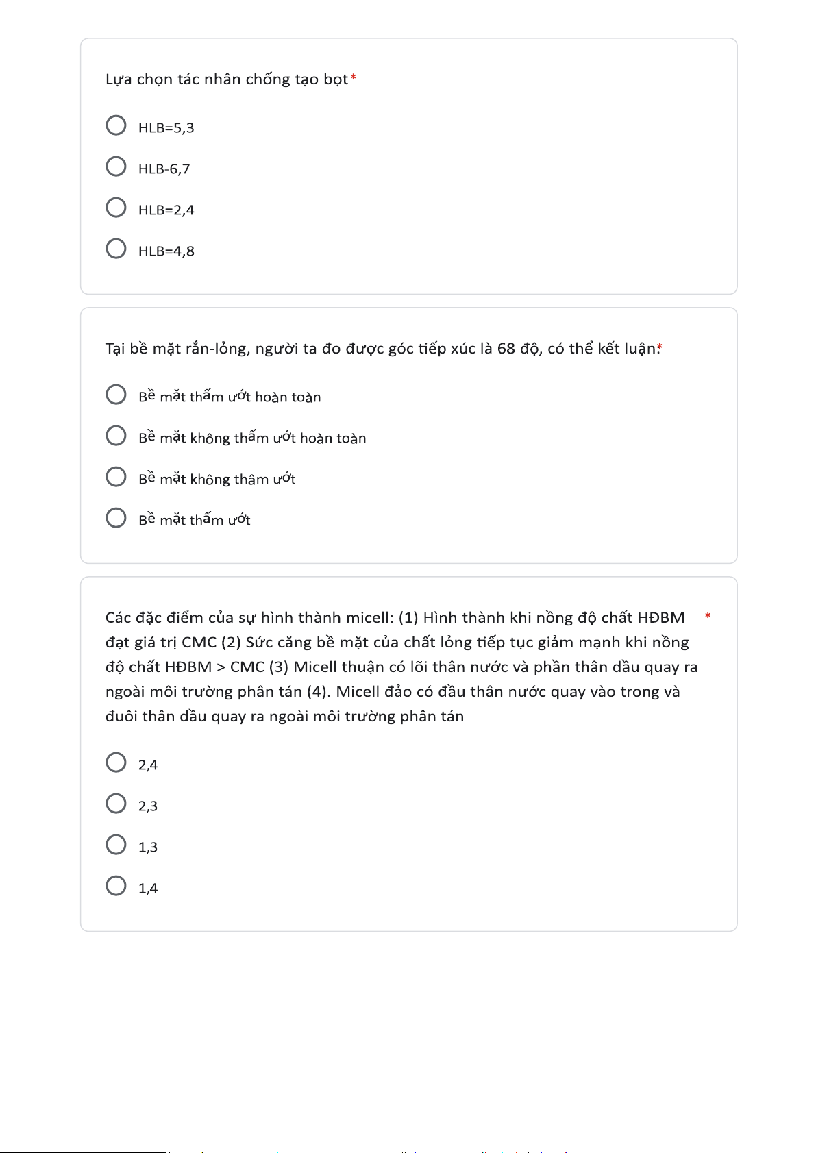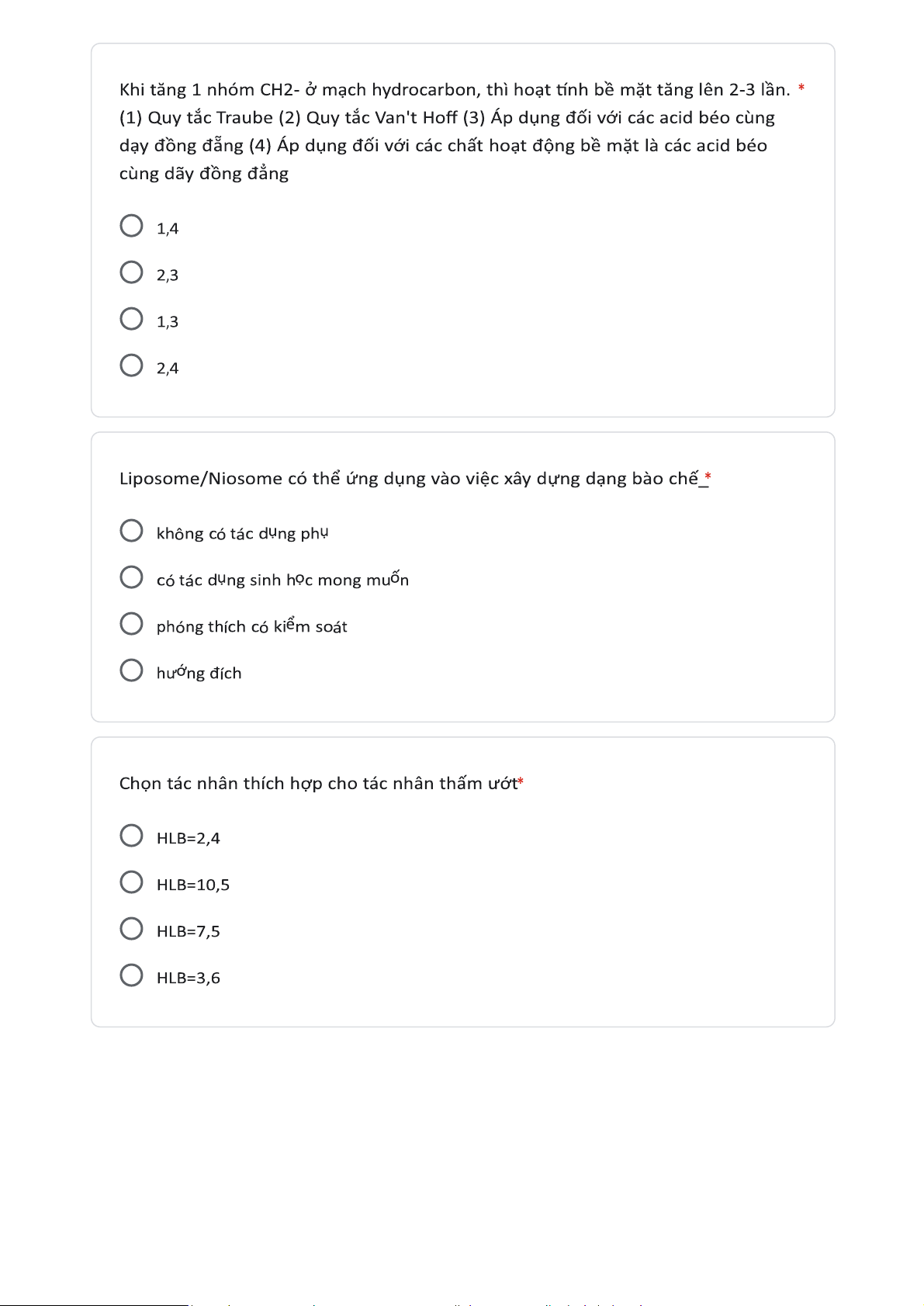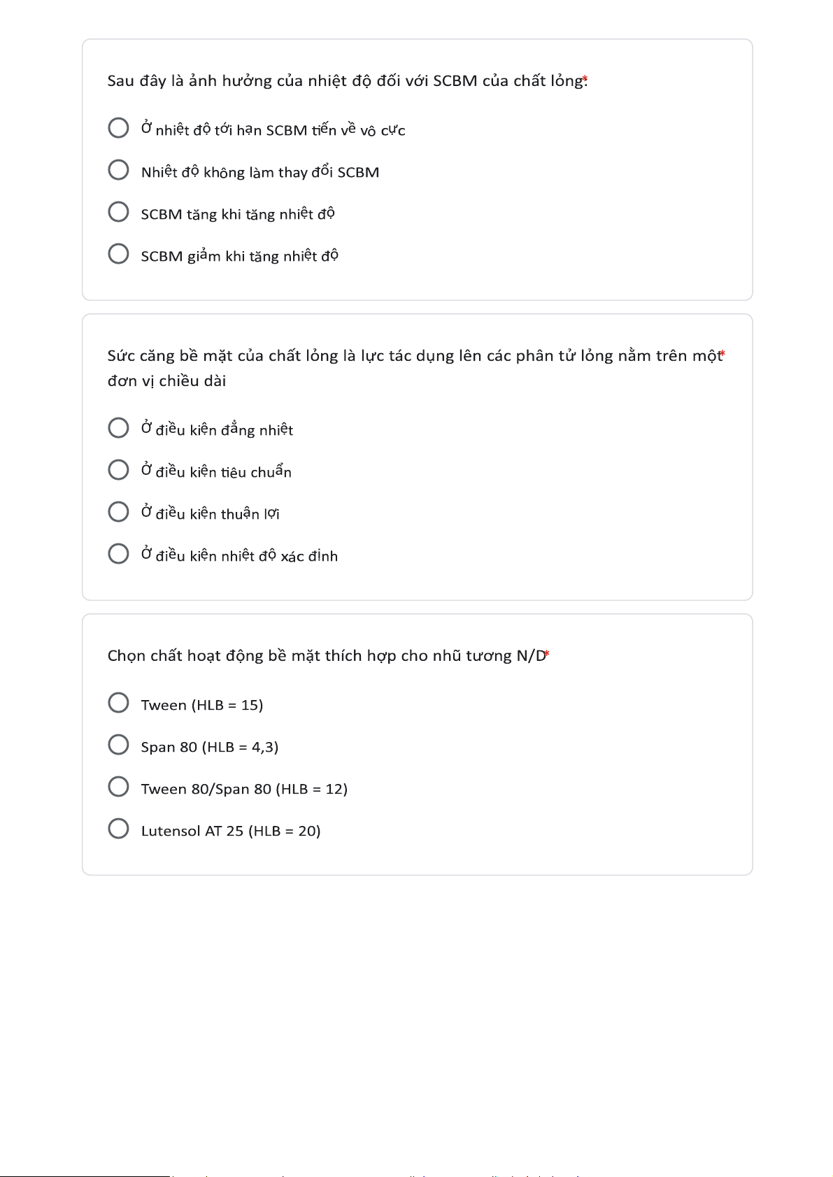 Sau đây là ảnh hưởng của nhiệt độ với SCBM của chất lỏng. Sức căng bề mặt của chất lỏng là lực tác dụng lên các phân tử lỏng nằm trên một đơn vị chiều dài. Chọn tác nhân thích hợp cho tác nhân thẩm ướt. Chất nào sau đây làm tằn SCBM của chất lỏng. Tài liệu giúp bạn tham khảo, ôn tập và đạt kết quả cao. Mời đọc đón xem!