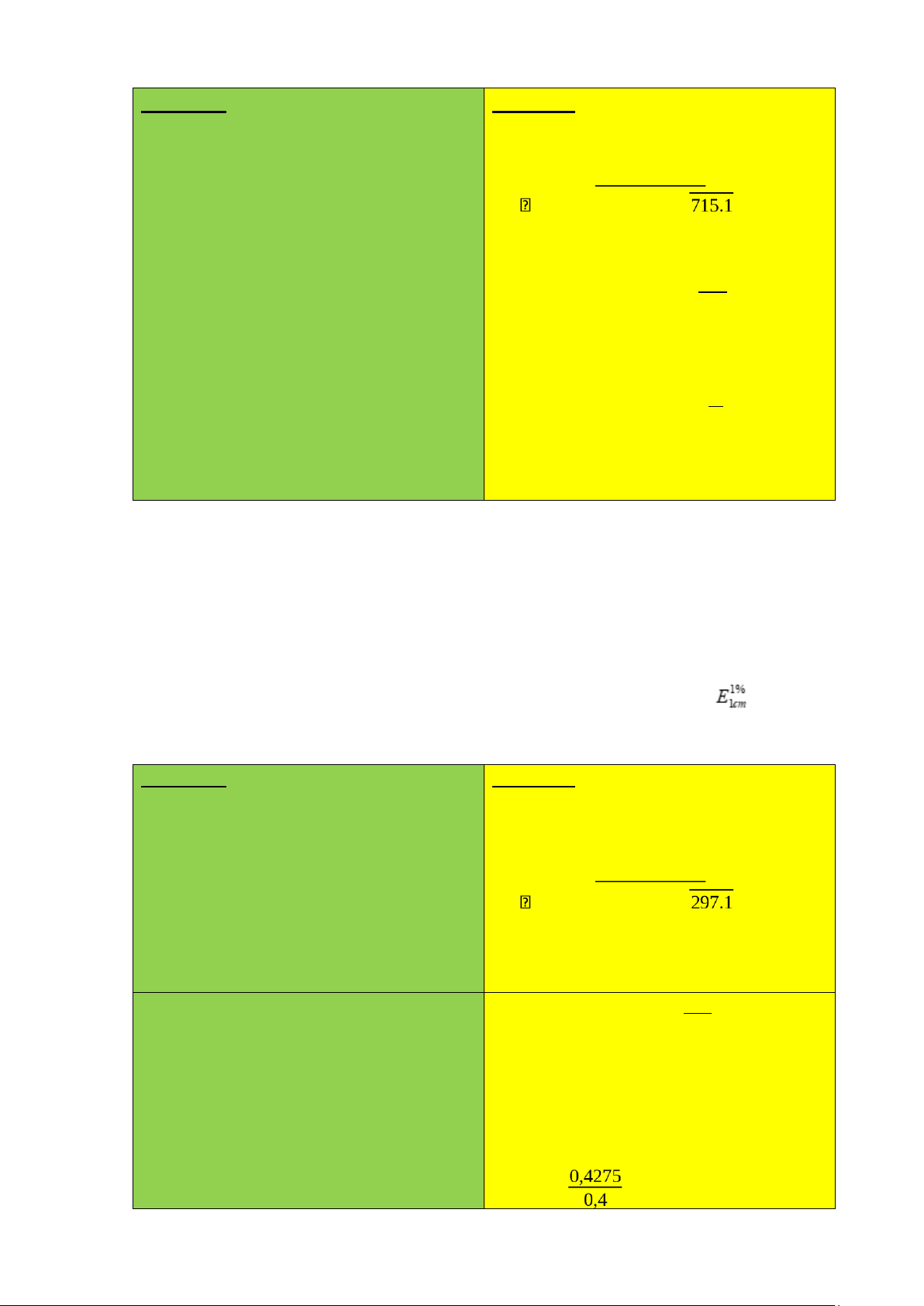 Nồng độ dung dịch cloramphenicol đem L = 1cm đi đo quang là: A = 0,508 A=A(1%,1cm).l.Cs A(1%,1cm)=297 A 0,508