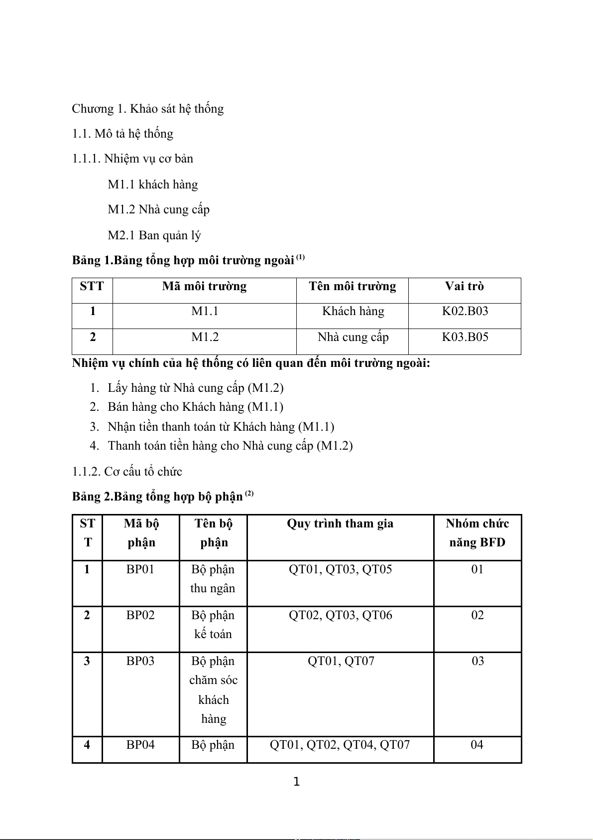 Bảng 1.Bảng tổng hợp môi trường ngoài (1) STT Mã môi trường Tên môi trường Vai trò 1 M1.1 Khách hàng K02.B03 2 M1.2 Nhà cung cấp K03.B05
