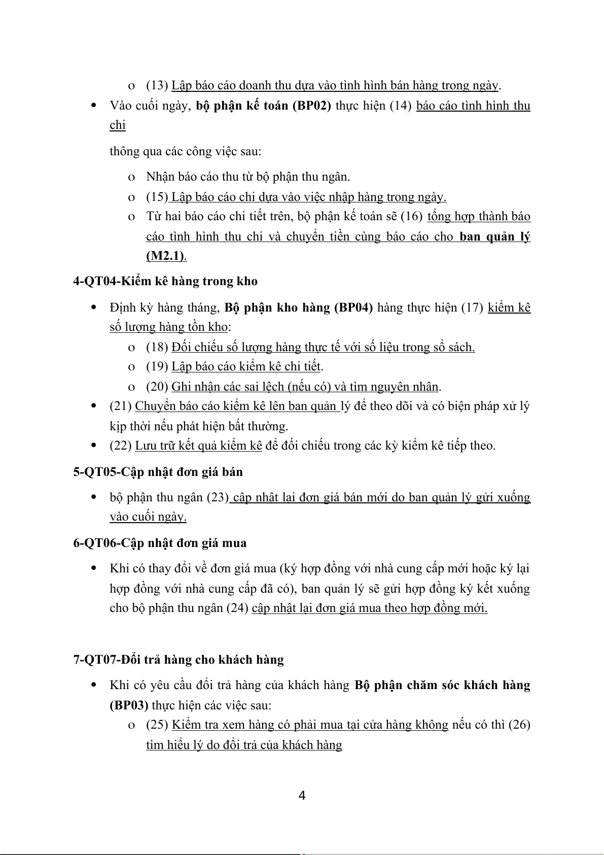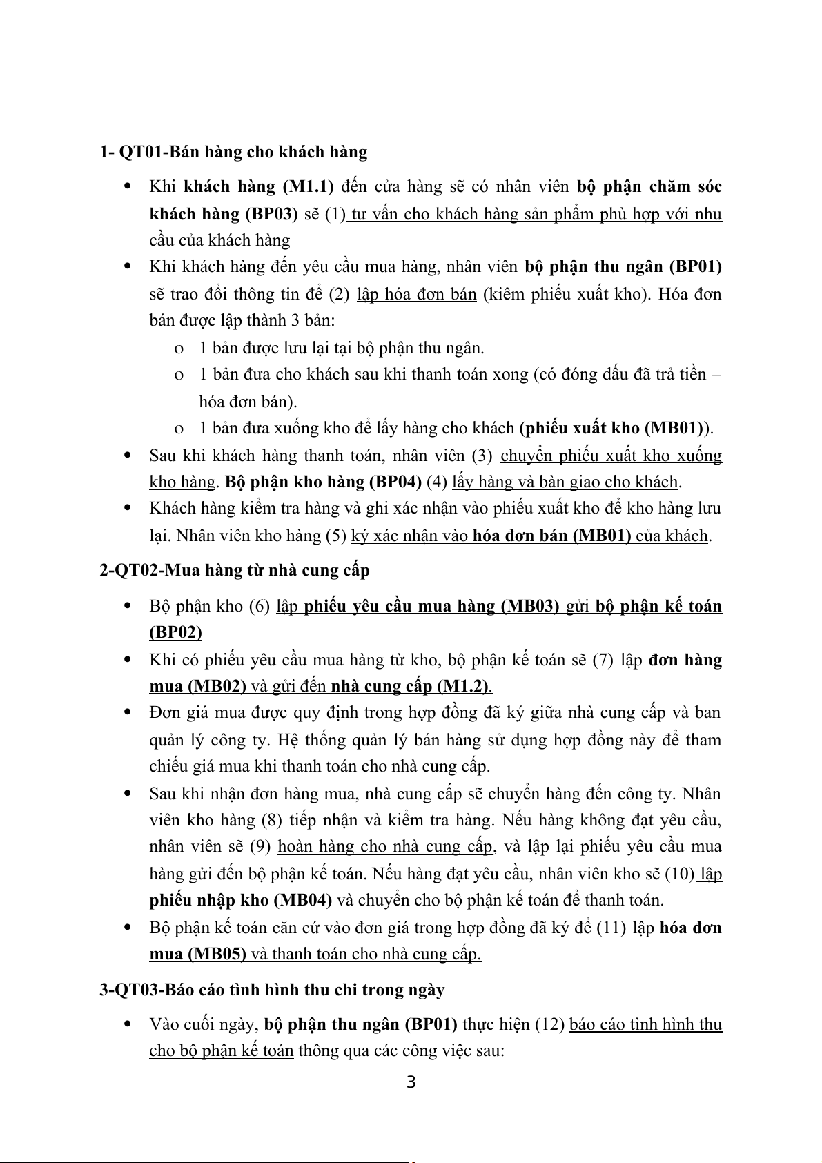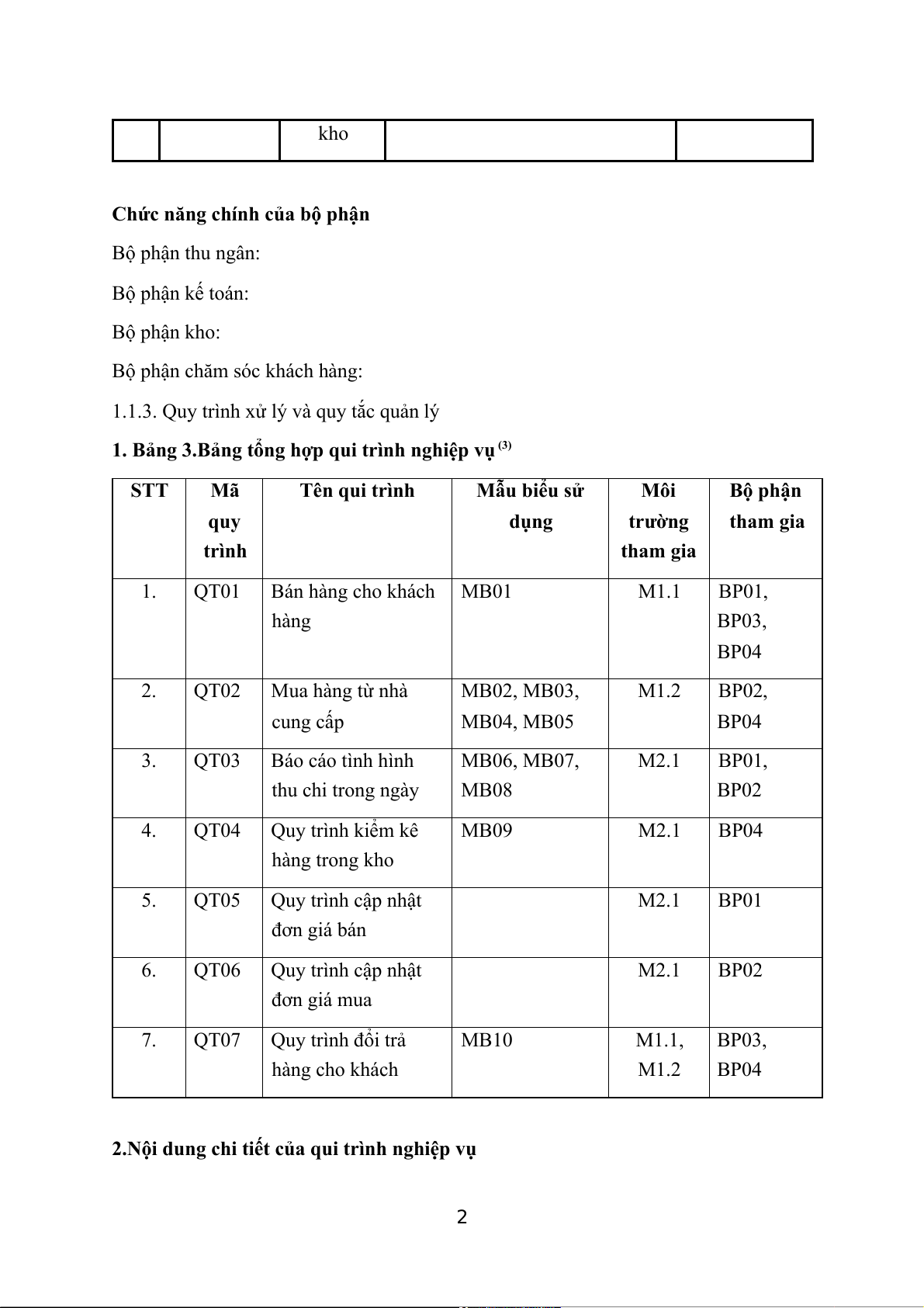 1. Bảng 3.Bảng tổng hợp qui trình nghiệp vụ (3) STT Mã Tên qui trình Mẫu biểu sử Môi Bộ phận quy dụng trường tham gia trình tham gia 1. QT01 Bán hàng cho khách MB01 M1.1 BP01, hàng BP03, BP04 2. QT02 Mua hàng từ nhà MB02, MB03, M1.2 BP02, cung cấp MB04, MB05 BP04 3. QT03 Báo cáo tình hình MB06, MB07, M2.1 BP01, thu chi trong ngày MB08 BP02 4. QT04 Quy trình kiểm kê MB09 M2.1 BP04 hàng trong kho 5. QT05 Quy trình cập nhật M2.1 BP01 đơn giá bán 6. QT06 Quy trình cập nhật M2.1 BP02 đơn giá mua 7. QT07 Quy trình đổi trả MB10 M1.1, BP03, hàng cho khách M1.2 BP04
