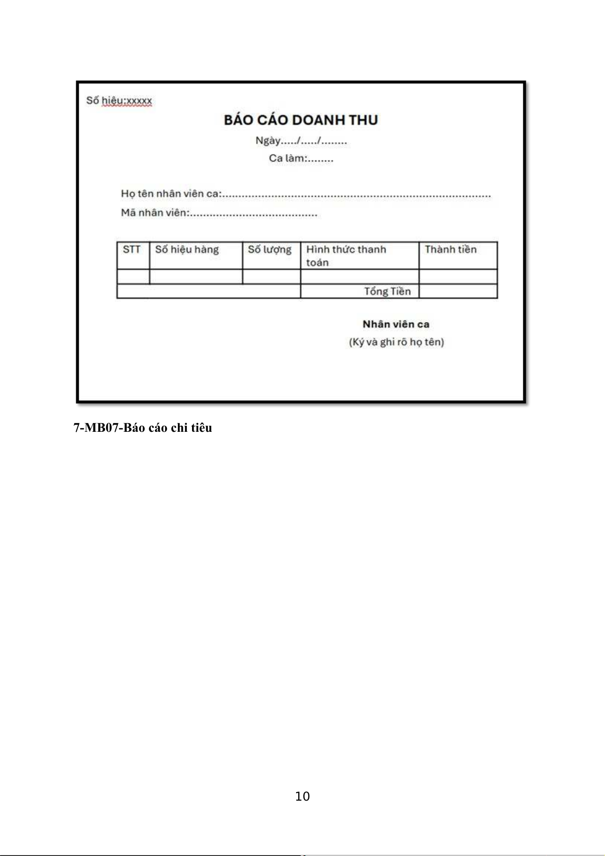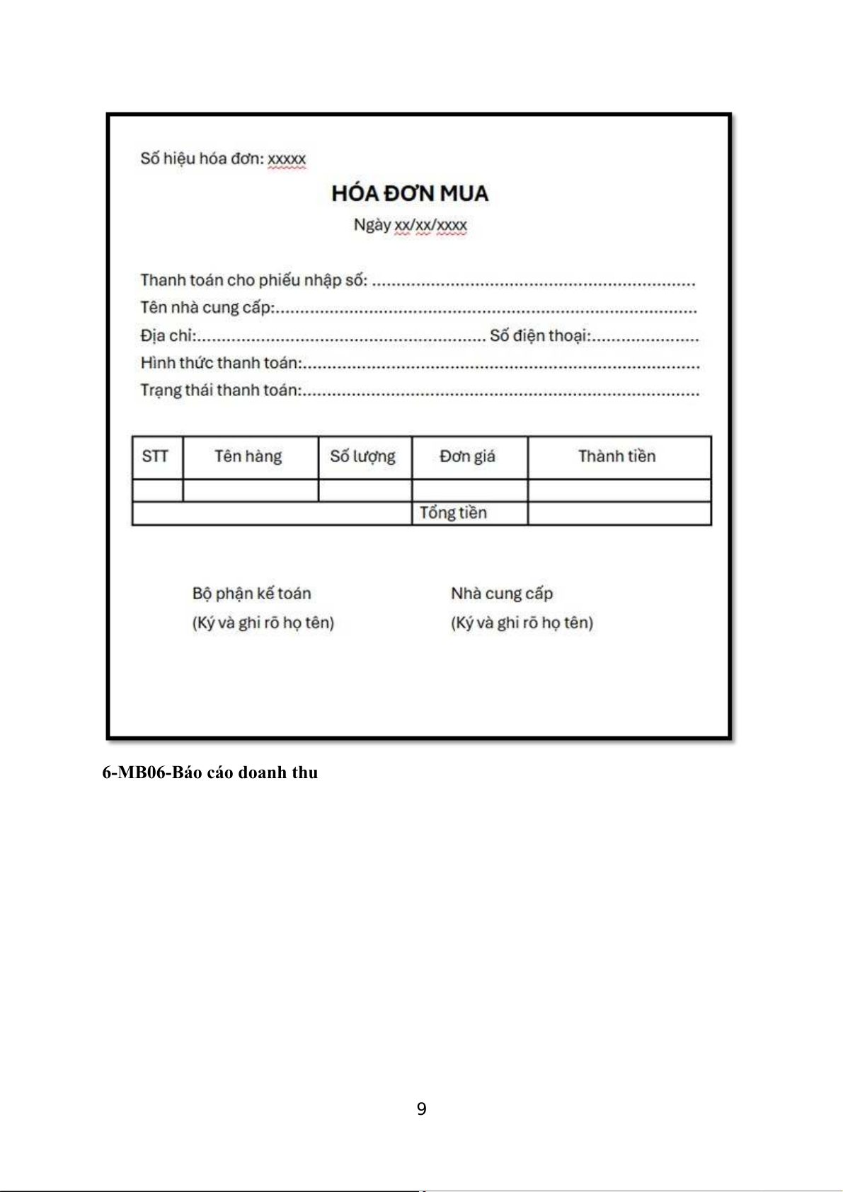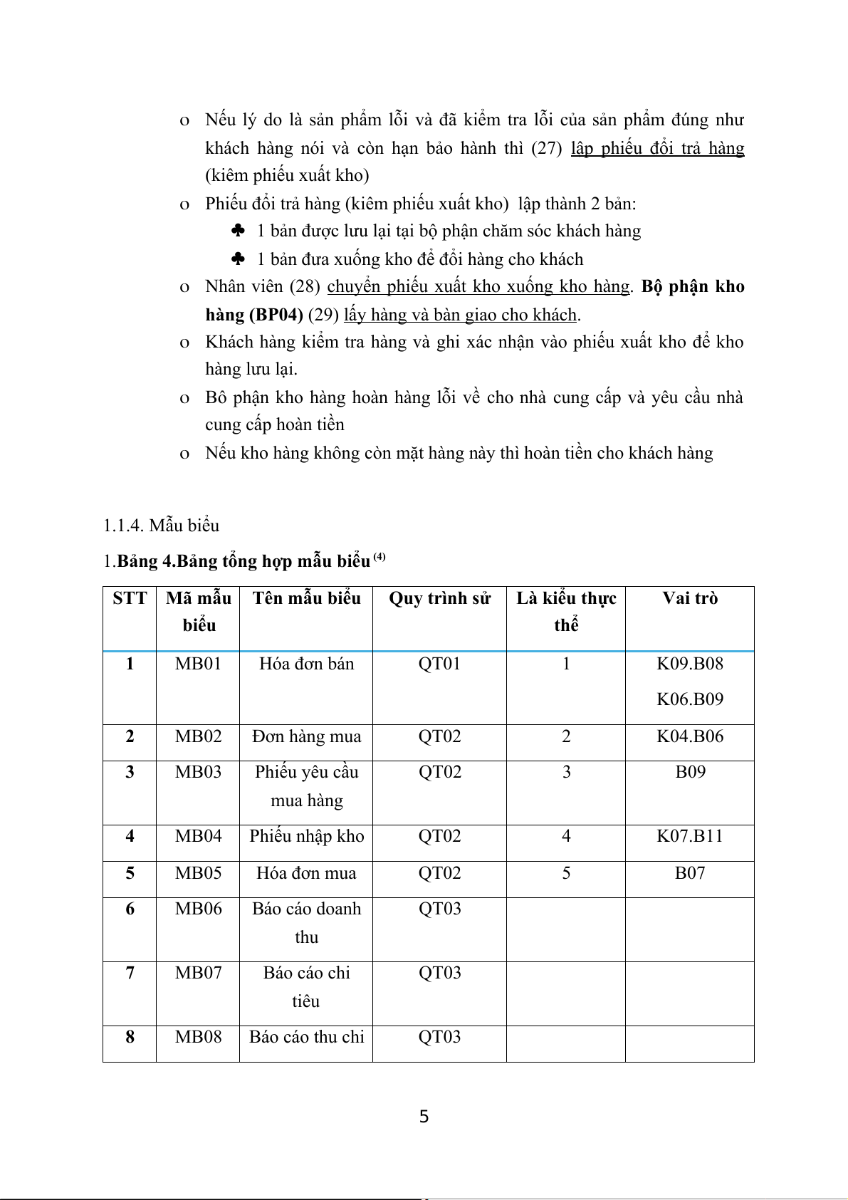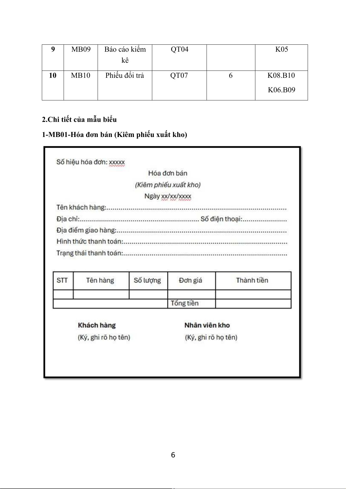 STT Mã mẫu Tên mẫu biểu Quy trình sử Là kiểu thực Vai trò biểu thể 1 MB01 Hóa đơn bán QT01 1 K09.B08 K06.B09 2 MB02 Đơn hàng mua QT02 2 K04.B06 3 MB03 Phiếu yêu cầu QT02 3 B09 mua hàng 4 MB04 Phiếu nhập kho QT02 4 K07.B11 5 MB05 Hóa đơn mua QT02 5 B07 6 MB06 Báo cáo doanh QT03 thu 7 MB07 Báo cáo chi QT03 tiêu 8 MB08 Báo cáo thu chi QT03 5 9 MB09 Báo cáo kiểm QT04 K05 kê 10 MB10 Phiếu đổi trả QT07 6 K08.B10 K06.B09