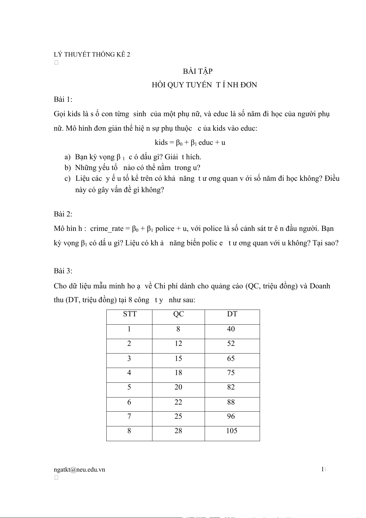 thu (DT, triệu đồng) tại 8 công t y như sau: STT QC DT 1 8 40 2 12 52 3 15 65 4 18 75 5 20 82 6 22 88 7 25 96 8 28 105 ngatkt@neu.edu.vn 1 LÝ THUYẾT THỐNG KÊ 2