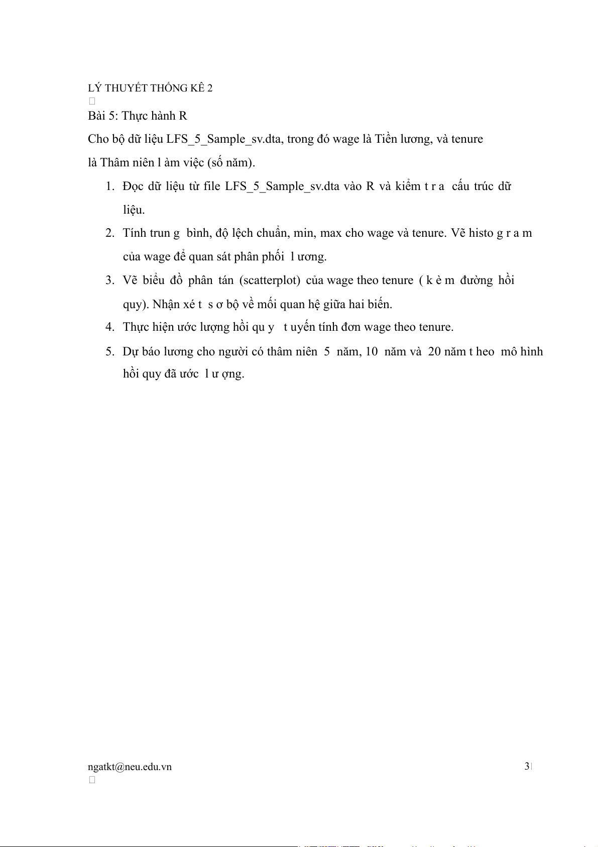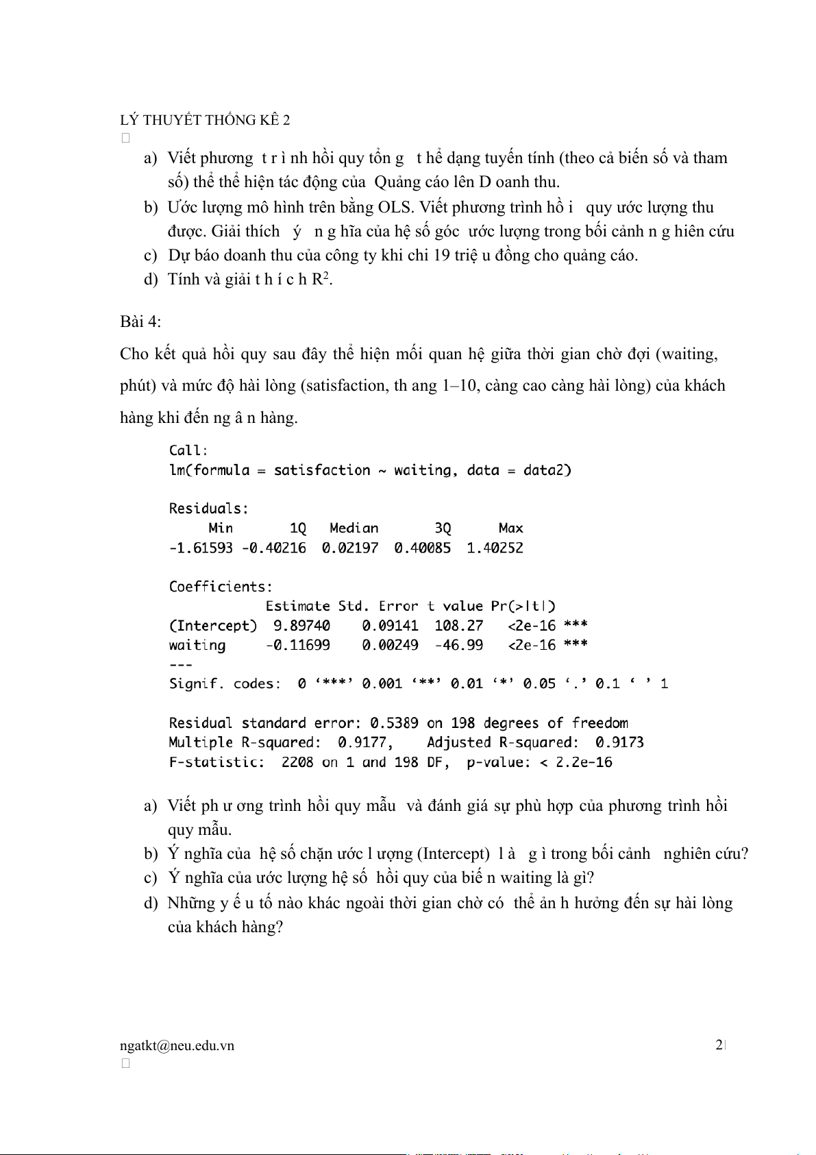 d) Những y ế u tố nào khác ngoài thời gian chờ có thể ản h hưởng đến sự hài lòng của khách hàng? ngatkt@neu.edu.vn 2 LÝ THUYẾT THỐNG KÊ 2 Bài 5: Thực hành R