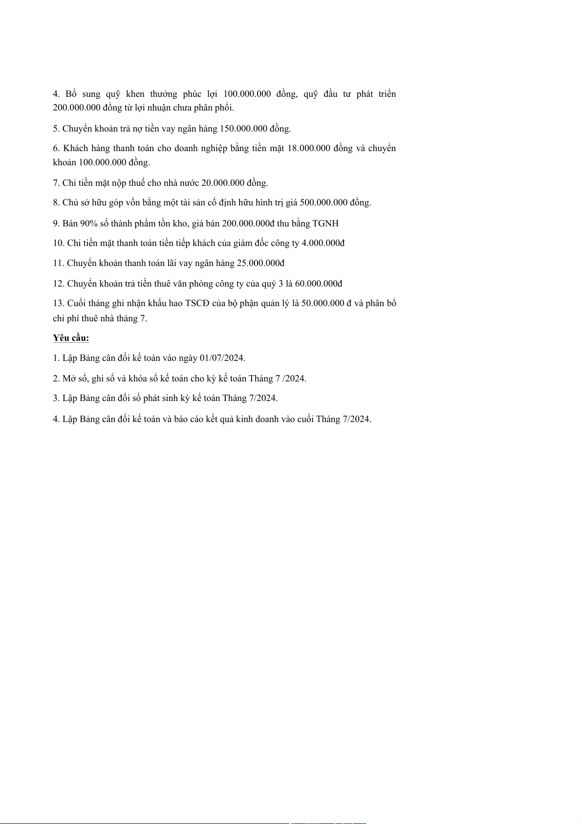 4. Lập Bảng cân đối kế toán và báo cáo kết quả kinh doanh vào cuối Tháng 7/2024.