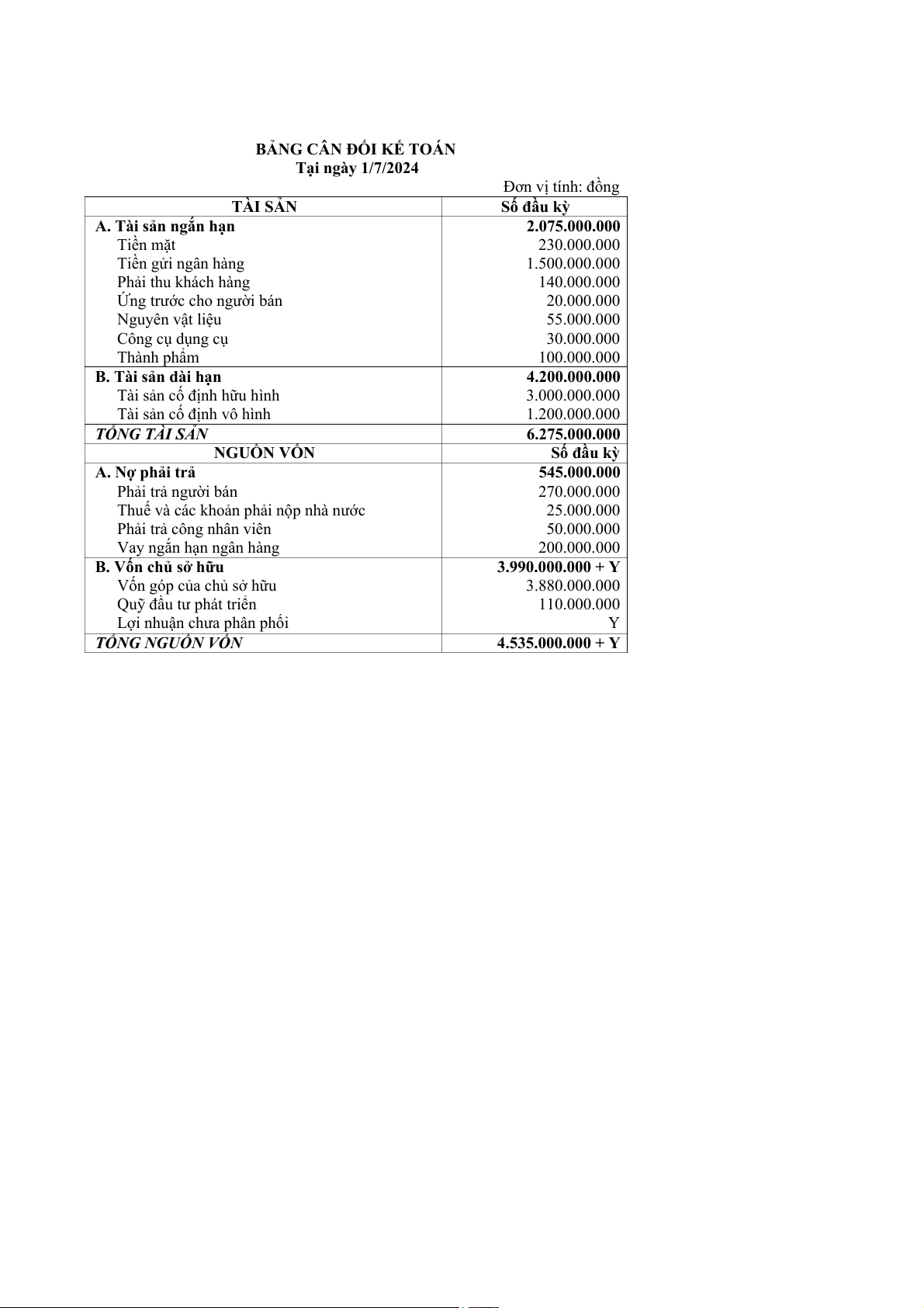 BẢNG CÂN ĐỐI KẾ TOÁN Tại ngày 1/7/2024 Đơn vị tính: đồng TÀI SẢN Số đầu kỳ