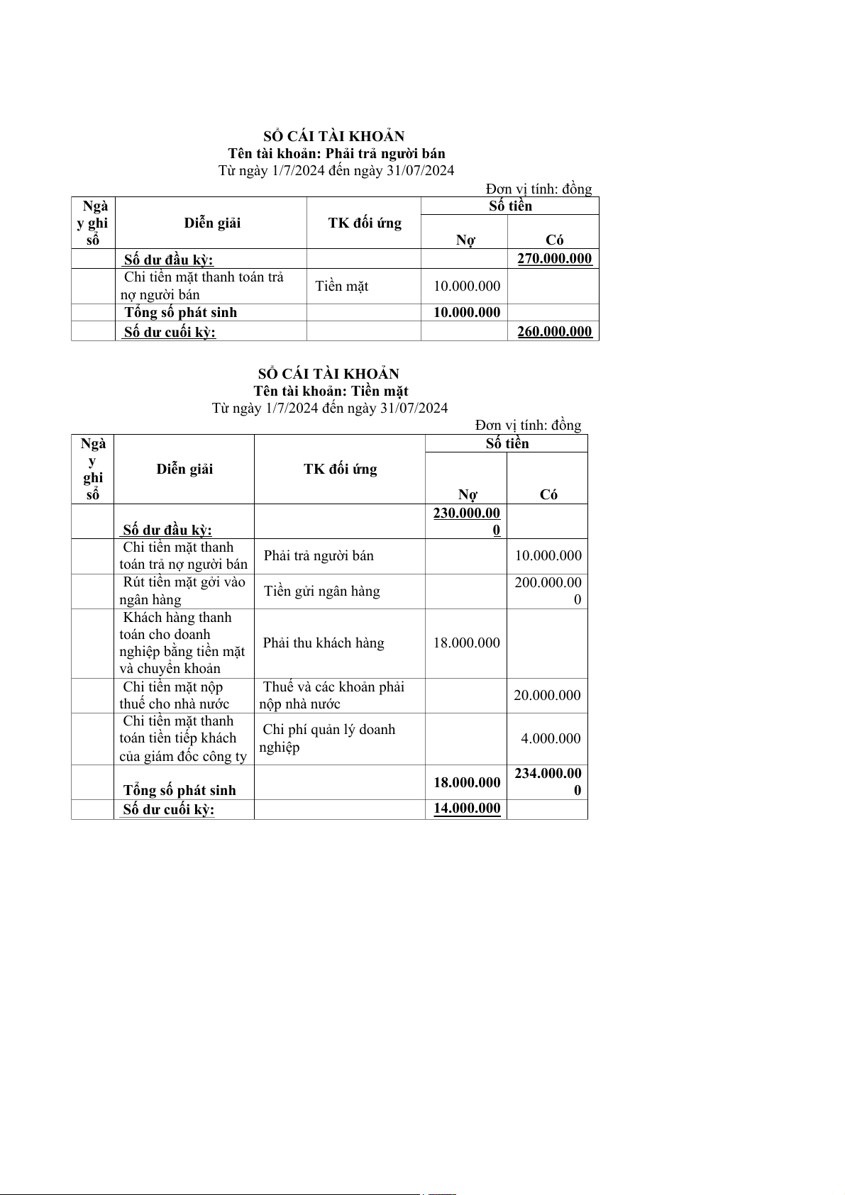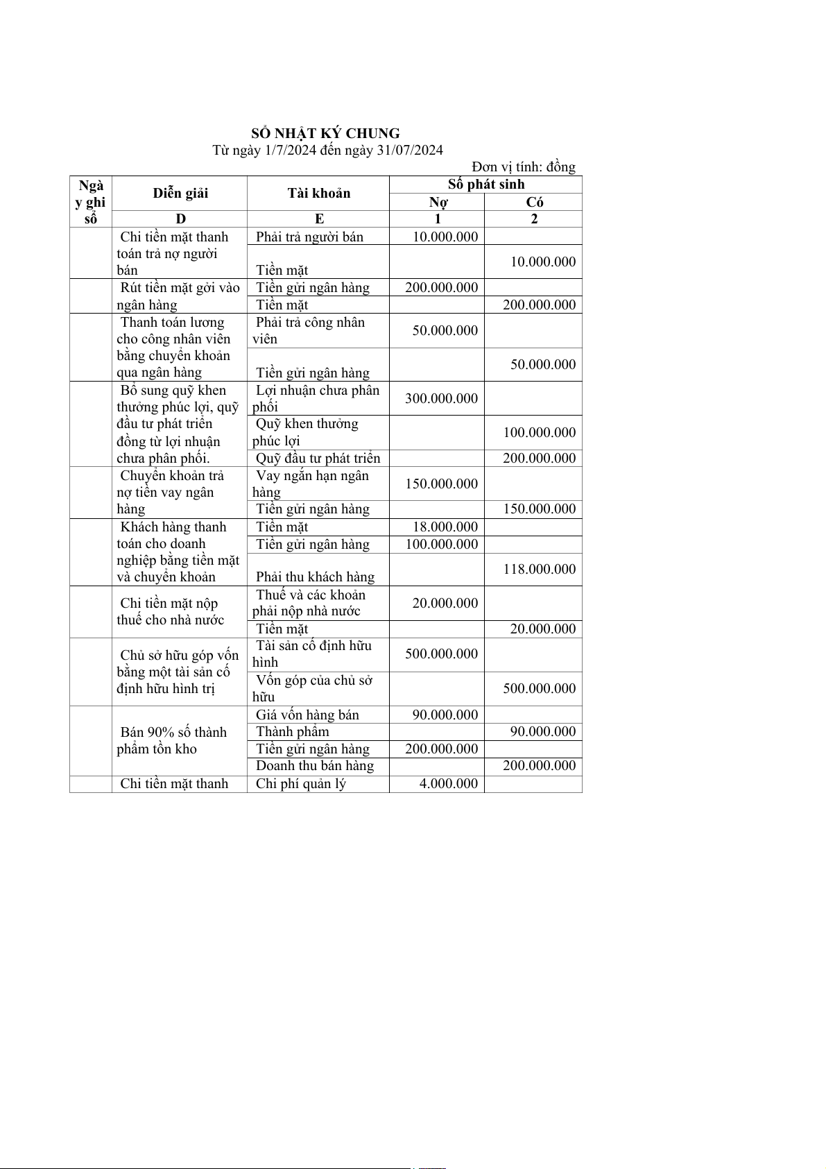 Từ ngày 1/7/2024 đến ngày 31/07/2024 Đơn vị tính: đồng Ngà Số phát sinh Diễn giải Tài khoản y ghi Nợ Có sổ D E 1 2 Chi tiền mặt thanh Phải trả người bán 10.000.000 toán trả nợ người bán 10.000.000 Tiền mặt
