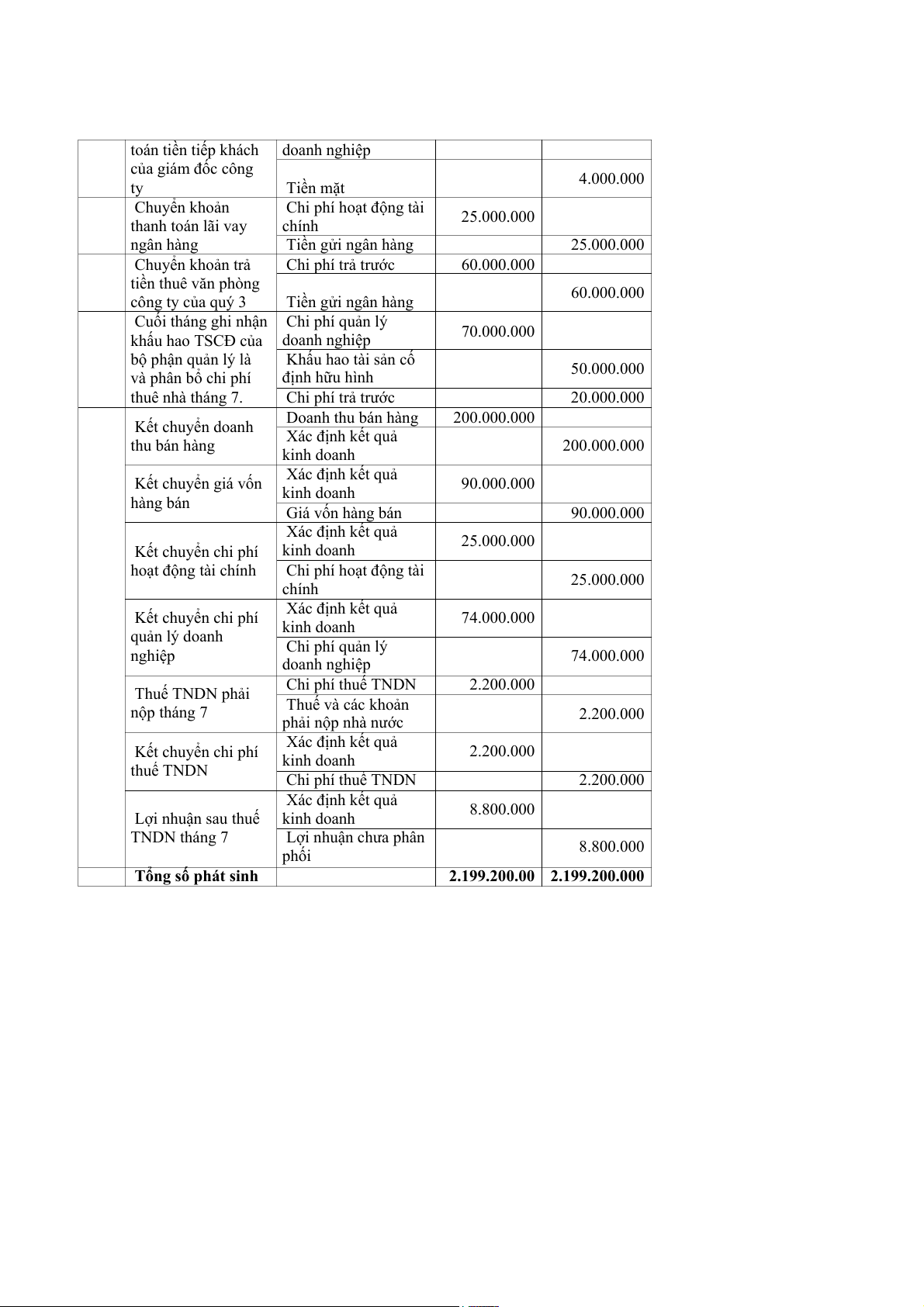 khấu hao TSCĐ của doanh nghiệp bộ phận quản lý là Khấu hao tài sản cố 50.000.000 và phân bổ chi phí định hữu hình thuê nhà tháng 7. Chi phí trả trước 20.000.000 Doanh thu bán hàng 200.000.000 Kết chuyển doanh Xác định kết quả thu bán hàng 200.000.000 kinh doanh Xác định kết quả Kết chuyển giá vốn 90.000.000 kinh doanh hàng bán Giá vốn hàng bán 90.000.000 Xác định kết quả 25.000.000 Kết chuyển chi phí kinh doanh hoạt động tài chính Chi phí hoạt động tài 25.000.000 chính Xác định kết quả Kết chuyển chi phí 74.000.000 kinh doanh quản lý doanh Chi phí quản lý nghiệp 74.000.000 doanh nghiệp Chi phí thuế TNDN 2.200.000 Thuế TNDN phải nộp tháng 7 Thuế và các khoản 2.200.000 phải nộp nhà nước Xác định kết quả Kết chuyển chi phí 2.200.000 kinh doanh thuế TNDN Chi phí thuế TNDN 2.200.000 Xác định kết quả 8.800.000 Lợi nhuận sau thuế kinh doanh TNDN tháng 7 Lợi nhuận chưa phân 8.800.000 phối Tổng số phát sinh