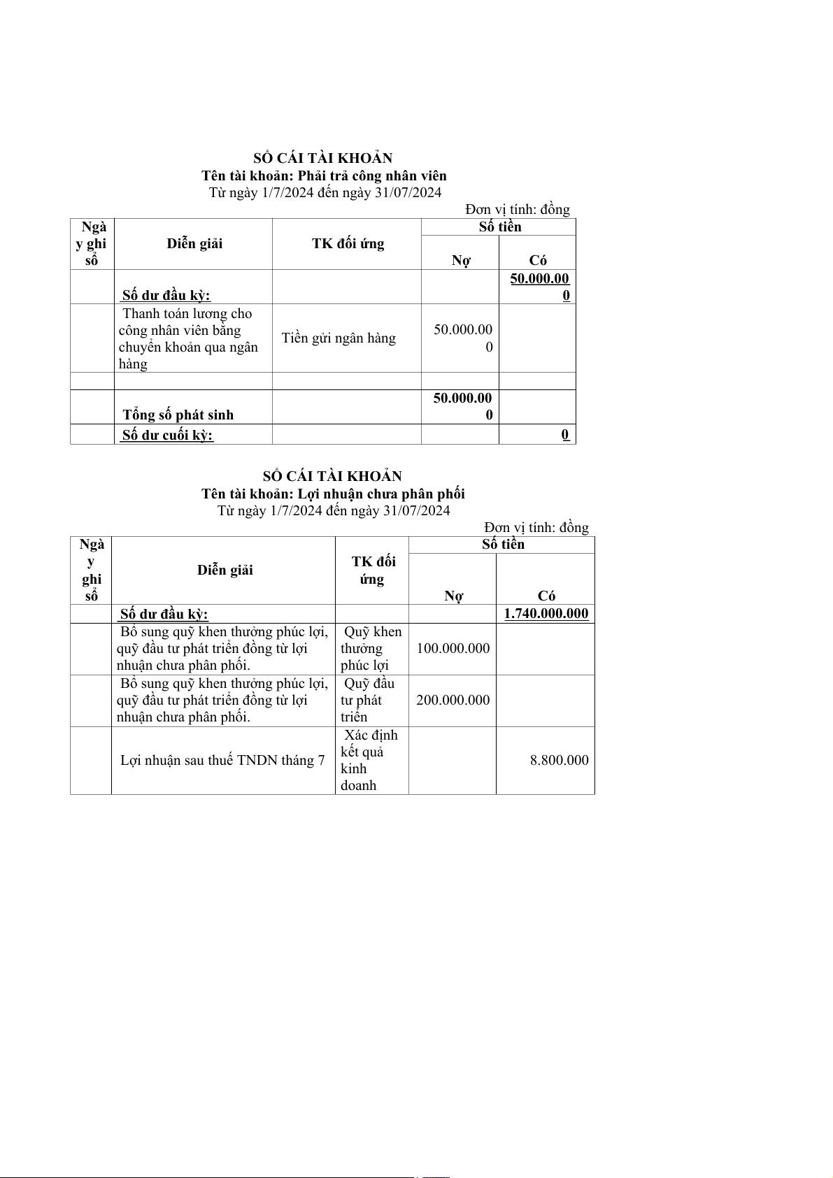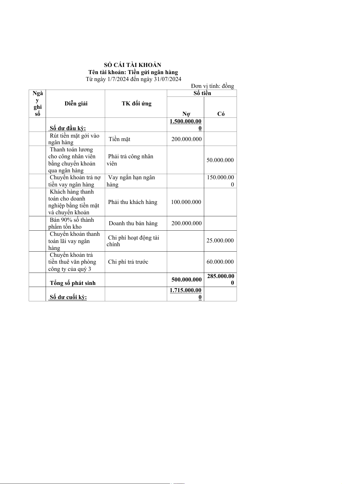 Từ ngày 1/7/2024 đến ngày 31/07/2024 Đơn vị tính: đồng Ngà Số tiền y ghi Diễn giải TK đối ứng sổ Nợ Có 50.000.00 Số dư đầu kỳ: 0 Thanh toán lương cho công nhân viên bằng 50.000.00 Tiền gửi ngân hàng chuyển khoản qua ngân 0 hàng 50.000.00 Tổng số phát sinh 0 Số dư cuối kỳ: 0 SỔ CÁI TÀI KHOẢN