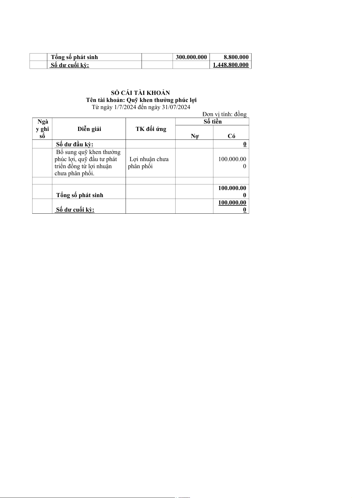 Lợi nhuận sau thuế TNDN tháng 7 8.800.000 kinh doanh Tổng số phát sinh 300.000.000 8.800.000 Số dư cuối kỳ: 1.448.800.000 SỔ CÁI TÀI KHOẢN