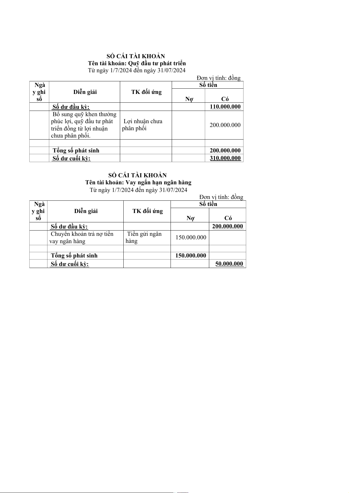 triển đồng từ lợi nhuận phân phối chưa phân phối. Tổng số phát sinh 200.000.000 Số dư cuối kỳ: 310.000.000 SỔ CÁI TÀI KHOẢN