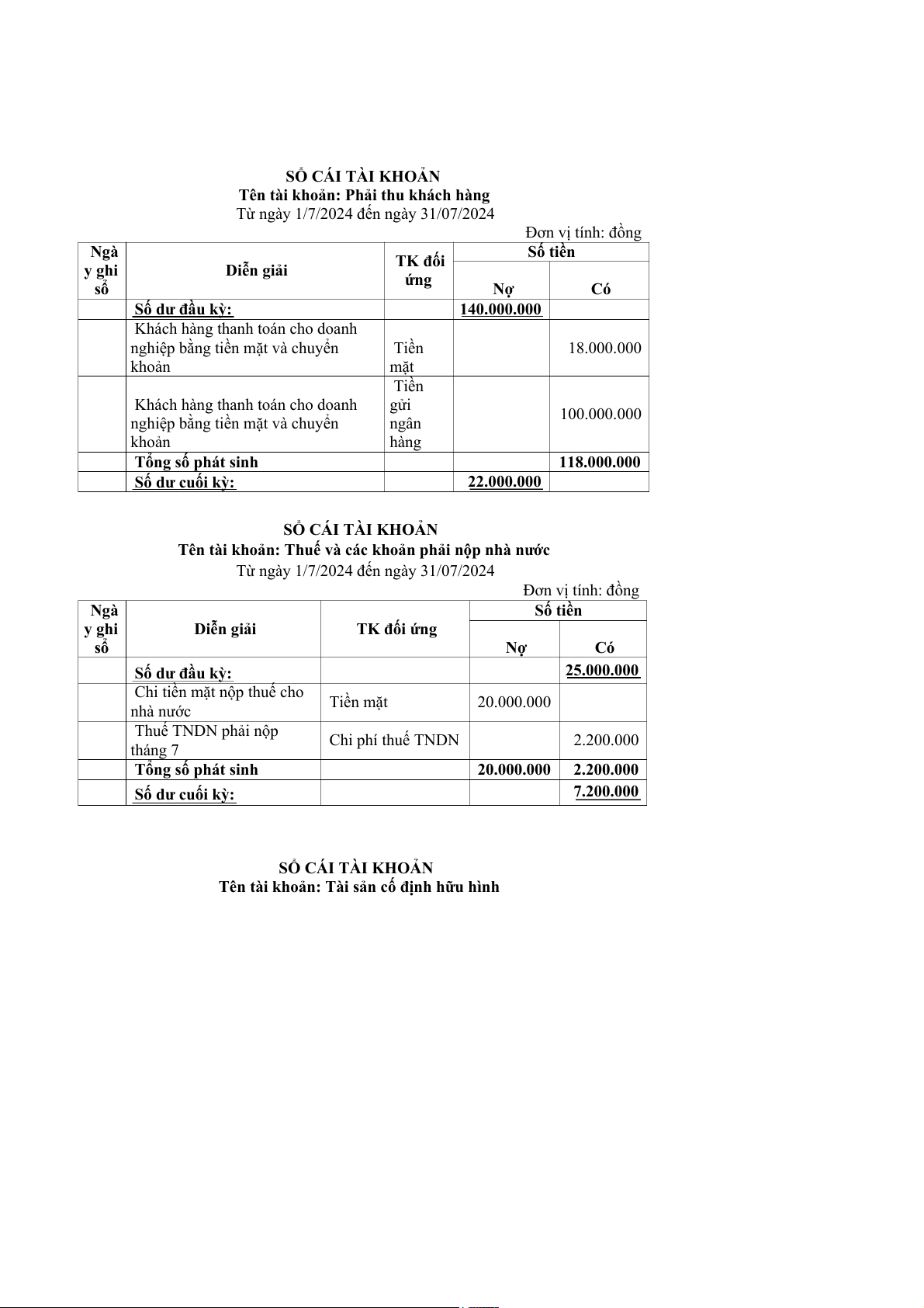 Từ ngày 1/7/2024 đến ngày 31/07/2024 Đơn vị tính: đồng Ngà Số tiền y Diễn giải TK đối ứng ghi sổ Nợ Có 1.500.000.00 Số dư đầu kỳ: 0
