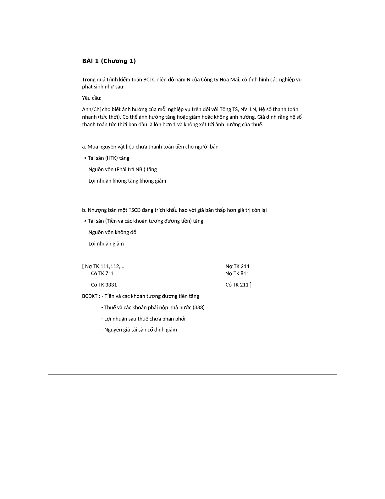 BÀI TẬP KIỂM TOÁN TÀI CHÍNH - CHƯƠNG 1 & 3: Phân Tích Nghiệp Vụ Tài Chính