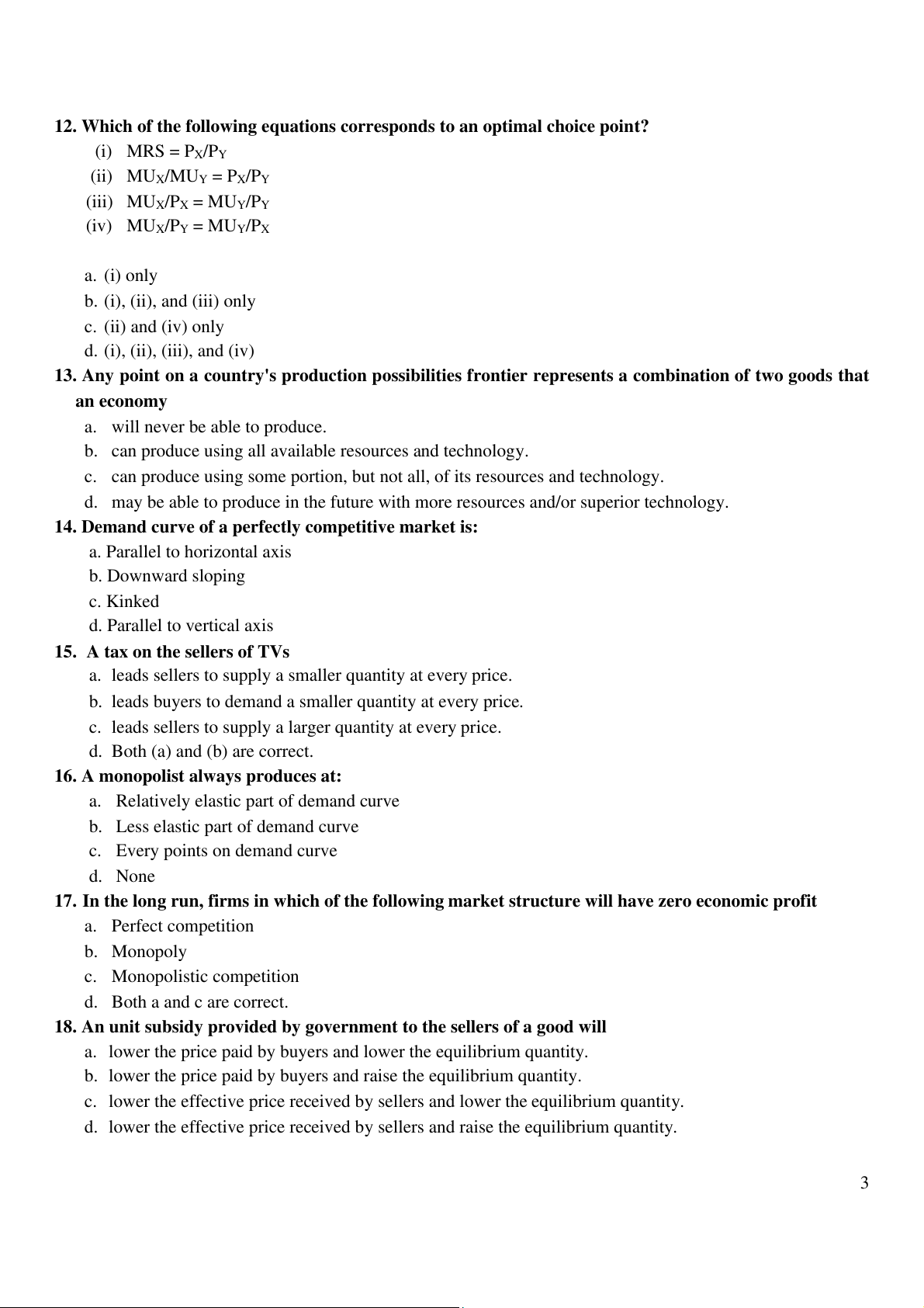 12. Which of the following equations corresponds to an optimal choice point? (i) MRS = PX/PY (ii) MUX/MUY = PX/PY (iii) MUX/PX = MUY/PY (iv) MUX/PY = MUY/PX a. (i) only b. (i), (ii), and (iii) only c. (ii) and (iv) only d. (i), (ii), (iii), and (iv)