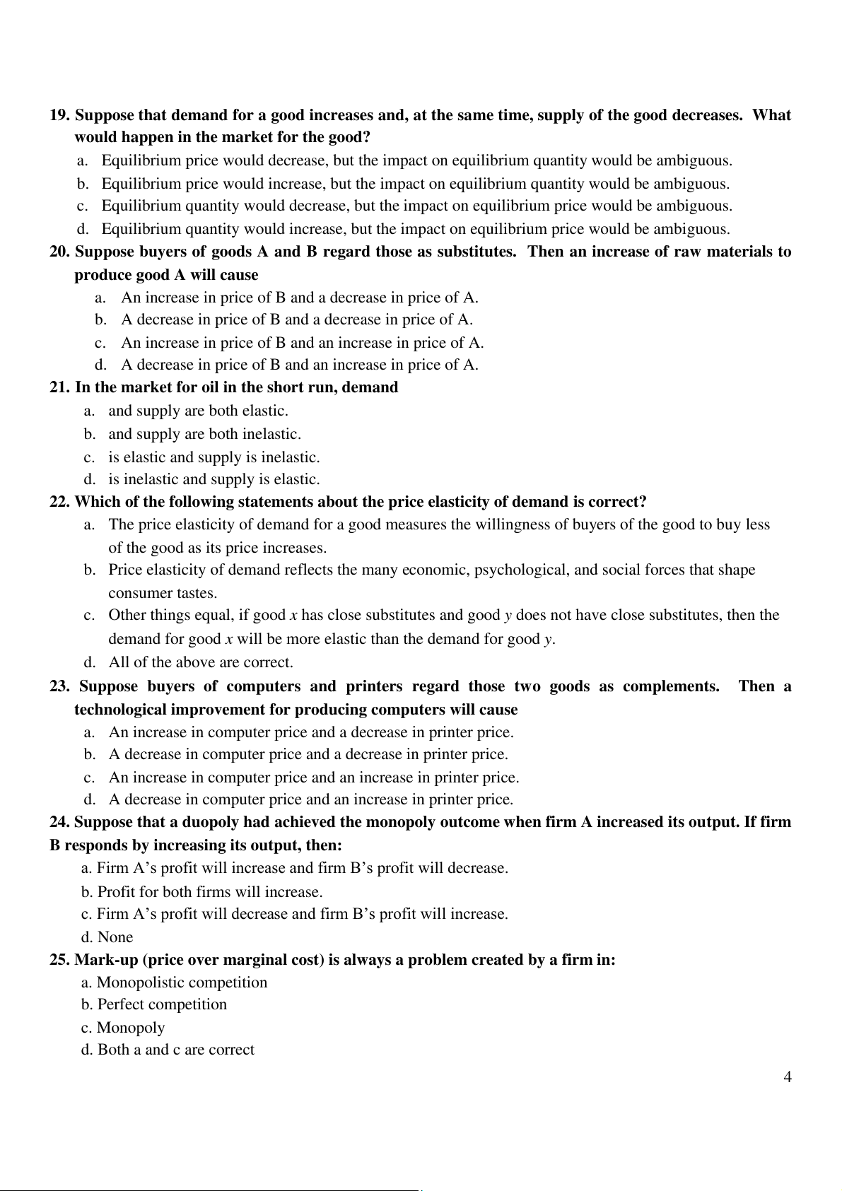 19. Suppose that demand for a good increases and, at the same time, supply of the good decreases. What