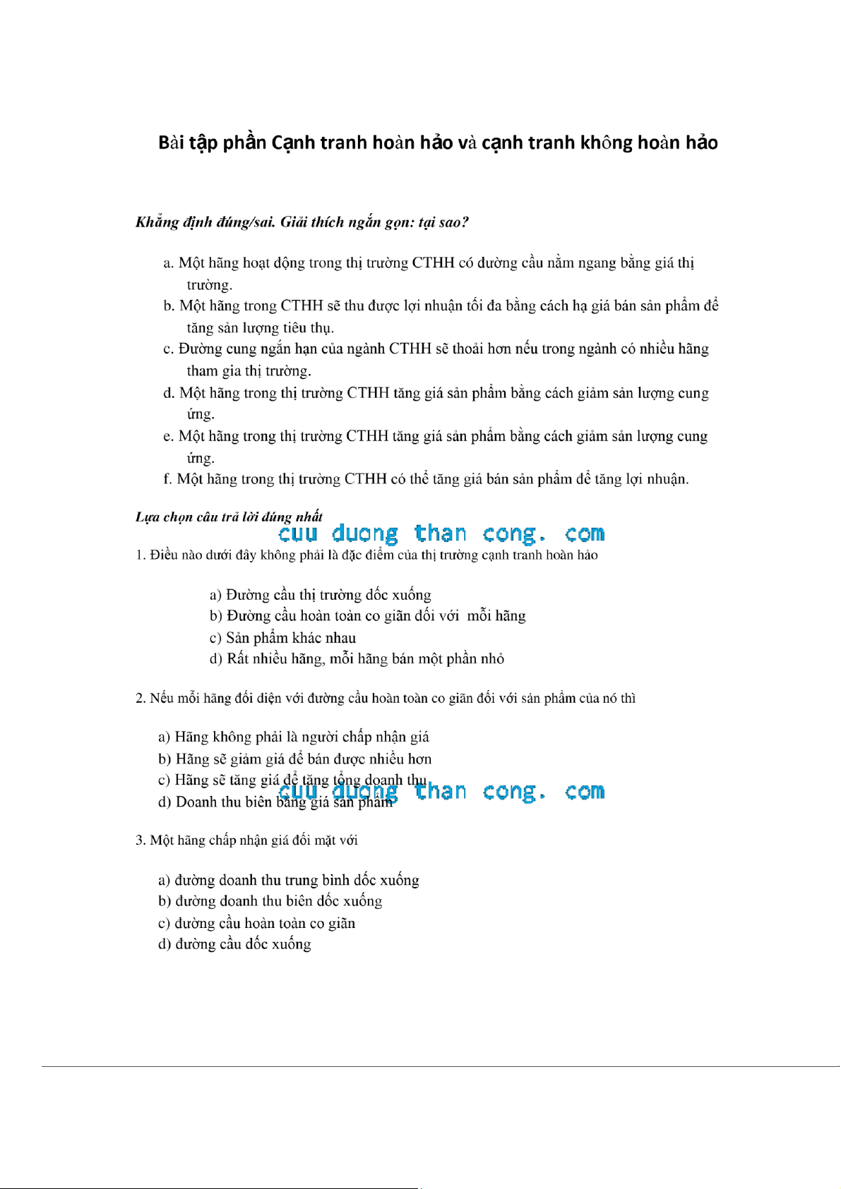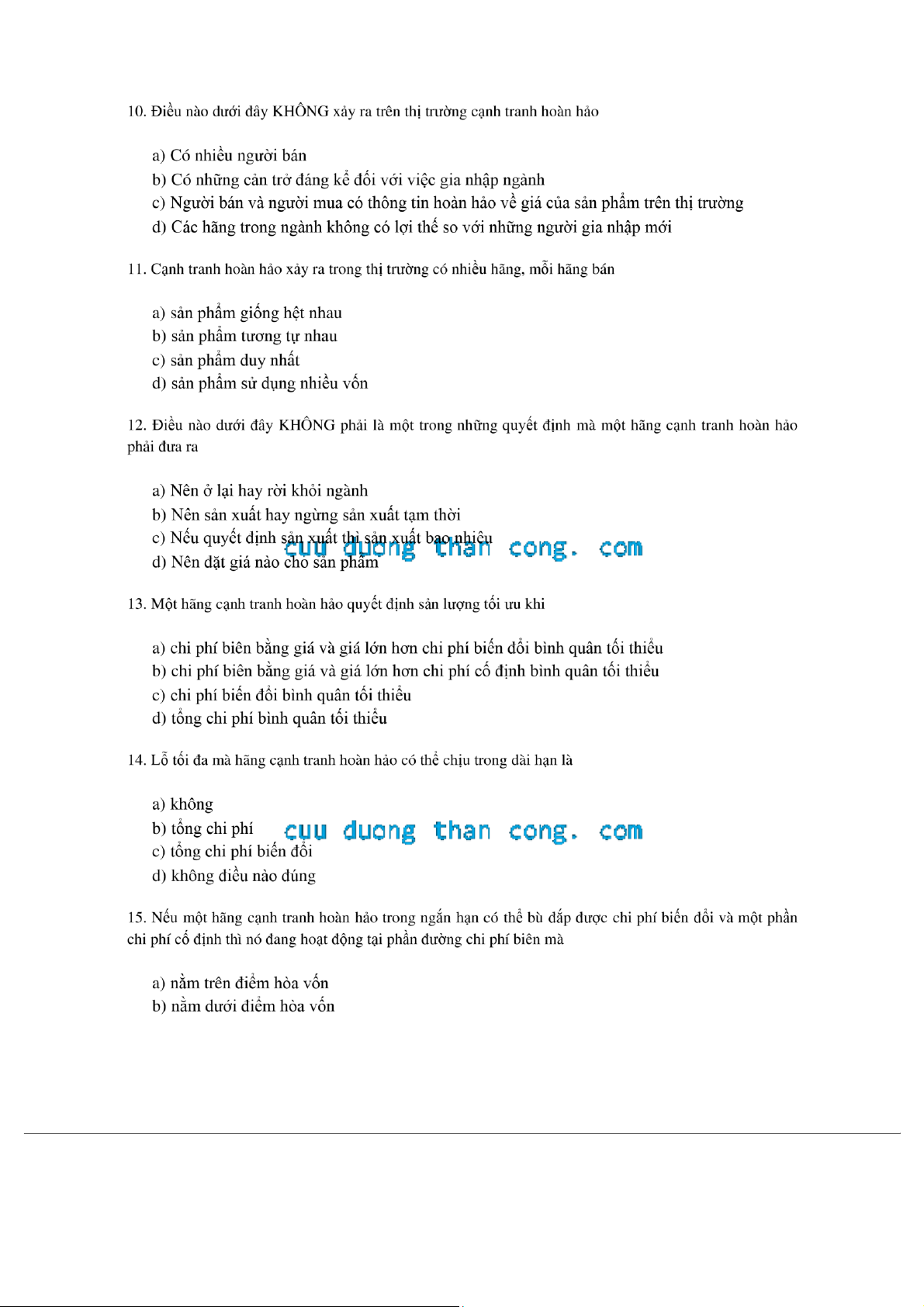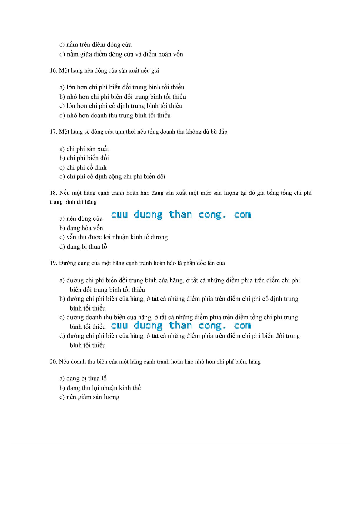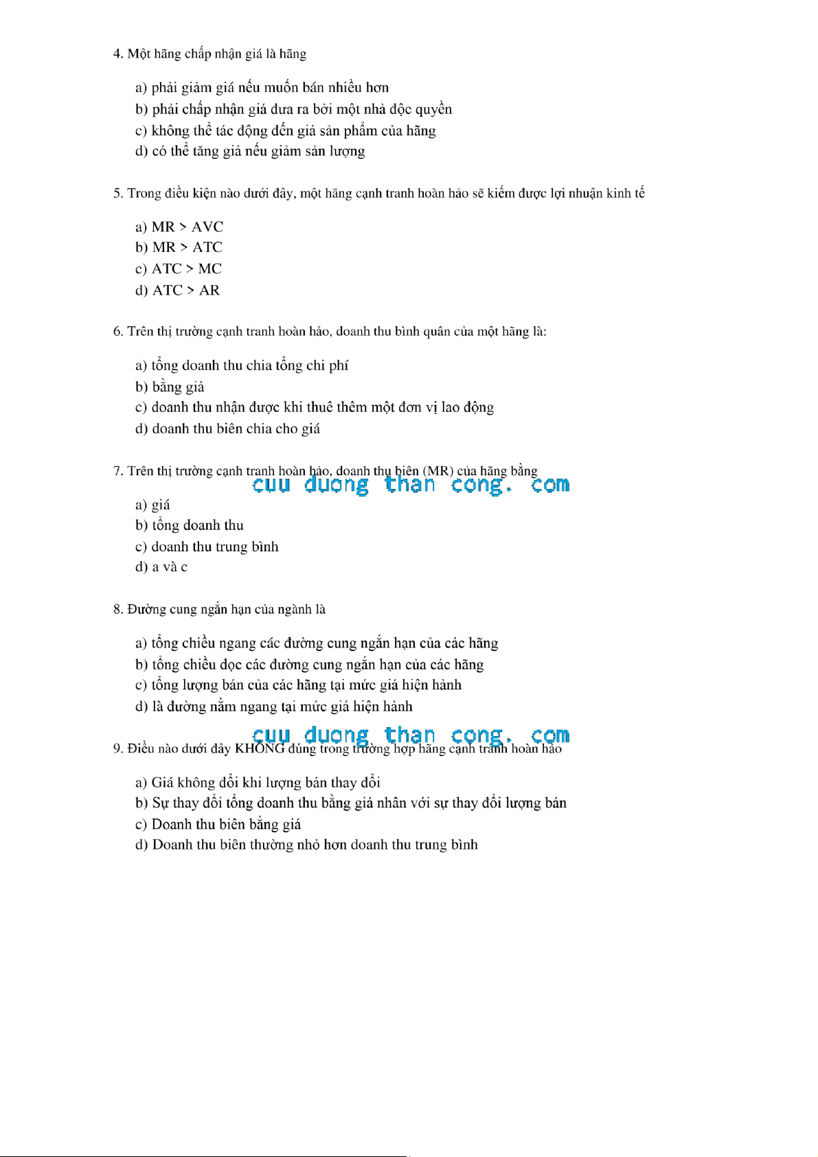 t hãng c nh tranh ho àn h o ch ính là a) b) c) d) không câu nào ng 30 . u nào d i i y k hông x y ra trong dà i h n khi m t ngành t o ra l i nh u n a) các hãng gia nh p ngành b) c) ng d) lợi nhuận giảm 31 . Cân b ng c nh tranh dài h n k hông th t n t i n u a) m i hãng t i b) rút lui c) thay d) ng 32 . M t hãng CTHH s a trong ng n h n k hi: a. b. c.
